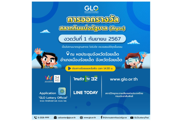 ทั้งนี้สามารถติดตามความเคลื่อนไหวและภารกิจที่น่าสนใจของ สำนักงานสลากกินแบ่งรัฐบาล ได้ที่ www.glo.or.th , Facebook Fanpage สำนักงานสลากกินแบ่งรัฐบาล และ Line Official : GLO Lottery