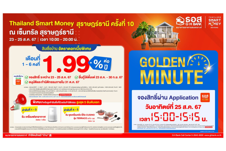 เมื่อวันที่ 22 ส.ค.67 ธนาคารอาคารสงเคราะห์ (ธอส.) ในฐานะสถาบันการเงินของรัฐ ที่มีพันธกิจ “ทำให้คนไทยมีบ้าน” เอาใจพี่น้องชาวภาคใต้ให้มีที่อยู่อาศัยเป็นของตนเองง่ายขึ้น ในงาน “Thailand Smart Money สุราษฎร์ธานี ครั้งที่ 10” ระหว่างวันที่ 23 – 25 สิงหาคม 2567 ณ เซ็นทรัล สุราษฎร์ธานี มีทั้งผลิตภัณฑ์และบริการทางการเงิน นำโดย (1) สินเชื่อบ้านอัตราดอกเบี้ยพิเศษ อัตราดอกเบี้ยเดือนที่ 1 - 6 คงที่เท่ากับ 1.99% ต่อปี, เดือนที่ 7 - 36 คงที่เท่ากับ 3.19% ต่อปี (อัตราดอกเบี้ยเฉลี่ย 3 ปีแรกเท่ากับ 2.99% เท่านั้น) และปีที่ 4 จนถึงตลอดอายุสัญญา กรณีลูกค้าสวัสดิการ เท่ากับ MRR-1.00% ต่อปี, ลูกค้ารายย่อย เท่ากับ MRR-0.50% ต่อปี และการกู้ชำระหนี้เกี่ยวกับที่อยู่อาศัย เท่ากับ MRR (อัตราดอกเบี้ย MRR ธอส. ในปัจจุบัน เท่ากับ 6.545% ต่อปี) ผ่อนชำระนานสูงสุดถึง 40 ปี ให้กู้ครอบคลุมทุกวัตถุประสงค์หลักอาทิ ซื้อบ้าน/คอนโดมิเนียม ปลูกสร้าง ต่อเติม ซ่อมแซม รีไฟแนนซ์ และชำระหนี้เกี่ยวกับที่อยู่อาศัย (หลักประกันในการยื่นกู้ต้องอยู่ในเขตพื้นที่จังหวัดสุราษฎร์ธานี ภูเก็ต พังงา กระบี่ นครศรีธรรมราช ตรัง สตูล พัทลุง สงขลา ยะลา ปัตตานี และนราธิวาส เท่านั้น) โดยสามารถจองสิทธิ์ผ่าน Line GHB Buddy ยื่นคำขอกู้ได้ตั้งแต่วันที่ 23 สิงหาคม – 30 กันยายน 2567 และทำนิติกรรมภายในวันที่ 31 ตุลาคม 2567 โดยผู้กู้จะได้สิทธิ์ค่าประเมินราคาหลักประกันอัตราพิเศษอีกด้วย และพิเศษสุด ๆ สำหรับลูกค้าภายในงานเท่านั้นจะได้พบกับช่วง Golden Minute อัตราดอกเบี้ยปีแรกเพียง 1.99% ต่อปี เปิดจองสิทธิ์ผ่าน Mobile Application : GHB ALL GEN ในวันอาทิตย์ที่ 25 สิงหาคม 2567 ระหว่างเวลา 15.00-15.15 น. จองก่อนได้ก่อน กรอบวงเงินจำกัด และเงื่อนไขตามที่ธนาคารกำหนด ทั้งนี้ สำหรับลูกค้าที่มีวงเงินทำนิติกรรมสูงสุด 5 อันดับแรก โดยอันดับที่ 1-3 รับเครื่องฟอกอากาศ (อันดับละ 1 สิทธิ์) และอันดับที่ 4-5 รับชุดเครื่องครัว ยี่ห้อ CUSINO รุ่น TERRACO 8 ชิ้น / ชุด (อันดับละ 1 สิทธิ์)