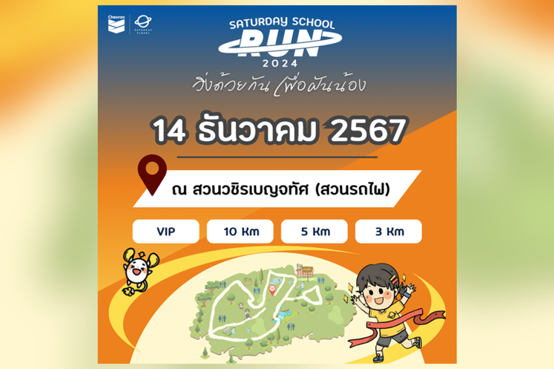 บริษัท เชฟรอนประเทศไทยสำรวจและผลิต จำกัด ร่วมกับ มูลนิธิโรงเรียนวันเสาร์ (Saturday School Foundation) ขอเชิญชวนทุกท่านเข้าร่วมกิจกรรมเดิน-วิ่งการกุศล “วิ่งด้วยกัน เพื่อฝันน้อง” (Saturday School Run 2024) เพื่อระดมทุน และนำรายได้ทั้งหมดโดยไม่หักค่าใช้จ่าย ไปใช้สนับสนุนภารกิจของมูลนิธิโรงเรียนวันเสาร์ หรือ Saturday School Foundation ในการจัดกิจกรรมที่มุ่งเน้นการพัฒนาทักษะและส่งเสริมการเรียนรู้นอกห้องเรียนให้กับเยาวชนทั่วประเทศ โดยงานเดิน-วิ่งการกุศลนี้จะจัดขึ้นในวันเสาร์ที่ 14 ธันวาคม 2567 เวลา 5.00 - 9:00 น. ณ สวนวชิรเบญจทัศ (สวนรถไฟ)