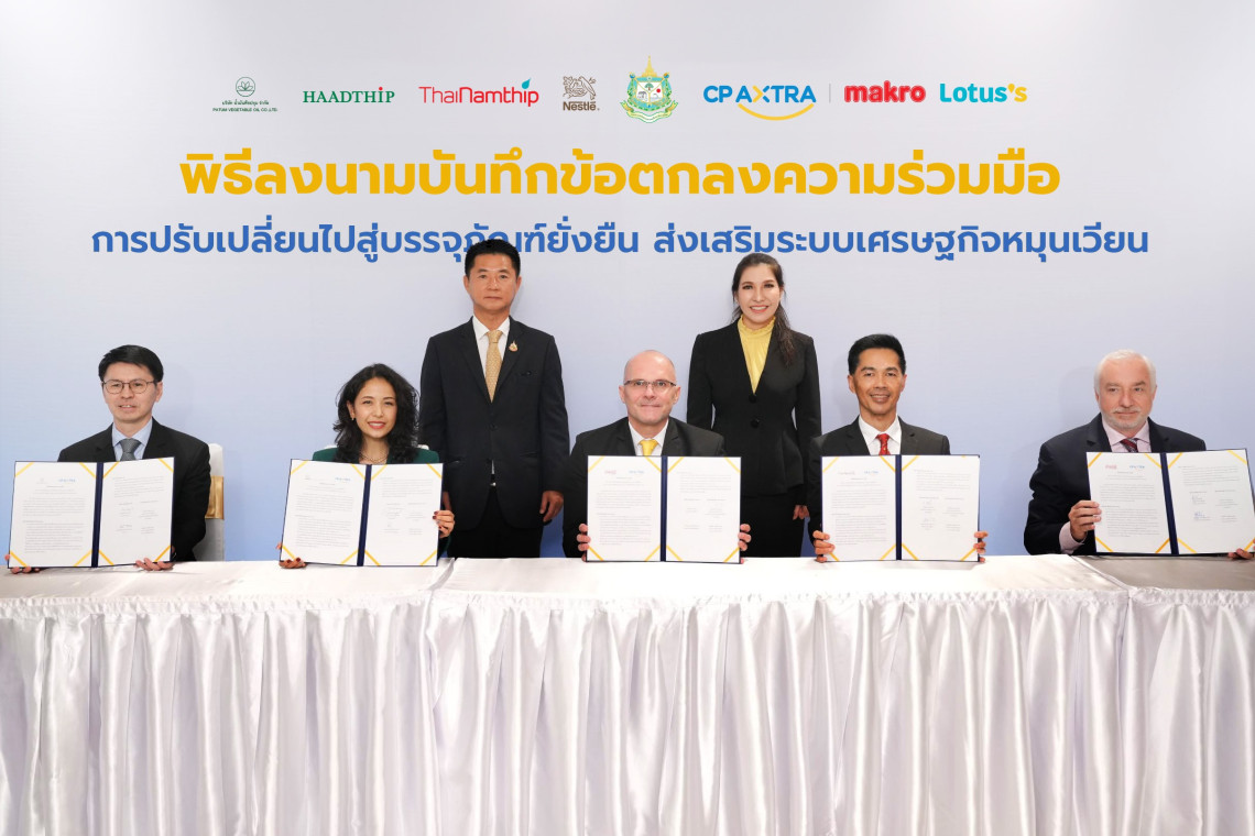 บริษัท ซีพี แอ็กซ์ตร้า จำกัด (มหาชน) ผู้นำธุรกิจค้าส่งค้าปลีก ‘แม็คโคร-โลตัส’ ร่วมลงนามในบันทึกข้อตกลงความร่วมมือ (MOU) กับพันธมิตรคู่ค้าชั้นนำ 4 บริษัท ได้แก่ บริษัท เนสท์เล่ (ไทย) จํากัด บริษัท ไทยน้ำทิพย์ คอร์ปอร์เรชั่น จำกัด บริษัท หาดทิพย์ จำกัด (มหาชน) และบริษัท น้ำมันพืชปทุม จำกัด ร่วมขับเคลื่อนการดำเนินธุรกิจเพื่อความยั่งยืน ด้วยวิสัยทัศน์ร่วมกันในการช่วยลดผลกระทบต่อสิ่งแวดล้อม ผ่านการสร้างระบบเศรษฐกิจหมุนเวียนและการใช้บรรจุภัณฑ์ยั่งยืน เพื่อสร้างการเปลี่ยนแปลงเชิงบวก เสริมสร้างความยั่งยืนในอุตสาหกรรมค้าส่งและค้าปลีกของไทยภายใต้การลงนามในบันทึกข้อตกลงความร่วมมือฉบับนี้ ซีพี แอ็กซ์ตร้า ร่วมกับพันธมิตรคู่ค้าสำคัญทั้ง 4 องค์กร จะร่วมกันเดินหน้าเปลี่ยนผ่านสู่การใช้ ‘บรรจุภัณฑ์ยั่งยืน’ โดยใช้วัสดุที่สามารถรีไซเคิล (Recyclable) ย่อยสลาย (Biodegradable) นำกลับมาใช้ใหม่ได้ (Recycled material) หรือมีส่วนผสมของวัสดุรีไซเคิล (Recycled Content)เพื่อจัดจำหน่ายให้กับ ซีพี แอ็กซ์ตร้า รวมถึงปรับเปลี่ยนป้าย และสื่อประชาสัมพันธ์ที่ผลิตจากพลาสติกโพลีพรอพิลีนำ(ฟิวเจอร์บอร์ด หรือพีพีบอร์ด) ภายในศูนย์จัดจำหน่ายสินค้าของ ซีพี แอ็กซ์ตร้า จำกัด (มหาชน) ให้เป็นวัสดุที่ย่อยสลายได้ หรือเป็นวัสดุที่สามารถนำไปรีไซเคิลได้อย่างแท้จริง