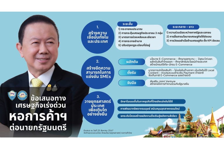 “ข้อเสนอระยะเร่งด่วนนี้จะช่วยทำให้ GDP ของไทยกลับมาเติบโตเฉลี่ยไม่ต่ำกว่า 3-5% ต่อปี โดยหอการค้าไทยและเครือข่ายสมาชิกทั่วประเทศพร้อมสนับสนุนและทำงานร่วมกับรัฐบาลอย่างใกล้ชิด เพื่อทำให้ประเด็นข้อเสนอทางเศรษฐกิจเหล่านี้สามารถขับเคลื่อนและเห็นผลเป็นรูปธรรม” นายสนั่นกล่าวทิ้งท้าย