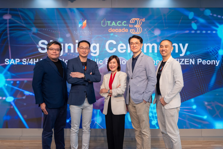 สุพจน์ ลีนานุรักษ์ รองกรรมการผู้จัดการ สายงานโรงงานและเทคโนโลยีสารสนเทศ สุวีรยา อังศวานนท์ ผู้ช่วยกรรมการผู้จัดการ สายงานบริหารคู่ค้าหลักและธุรกิจลิขสิทธิ์ บริษัทที.เอ.ซี. คอนซูเมอร์ จำกัด (มหาชน) หรือ TACC ถ่ายภาพร่วมกับ เสรี สาธุกิจชัย ประธานเจ้าหน้าที่ฝ่ายบริหาร บริษัท เนทติเซนท์ จำกัด นพดล เจริญทอง ผู้อำนวยการกลุ่มธุรกิจการตลาดขนาดกลาง เอสเอพี อินโดไชน่า บริษัท เนทติเซนต์ จำกัด เนื่องในโอกาสจัดพิธีลงนามสัญญา การนำระบบ SAP S/4 HANA Cloud Public Edition Version NETIZEN Peony มาใช้ในบริษัทฯ ท่ามกลางกระแส Digital Transformation ทำให้บริษัทฯ ต้องนำเทคโนโลยีใหม่ๆ มาขับเคลื่อนกระบวนการทางธุรกิจให้มีประสิทธิภาพยิ่งขึ้น เพื่อยกระดับการทำงานให้เป็นไปตามมาตรฐานสากล งานดังกล่าวจัดขึ้น ณ Netizen Life Center 28th Floor T-One Building