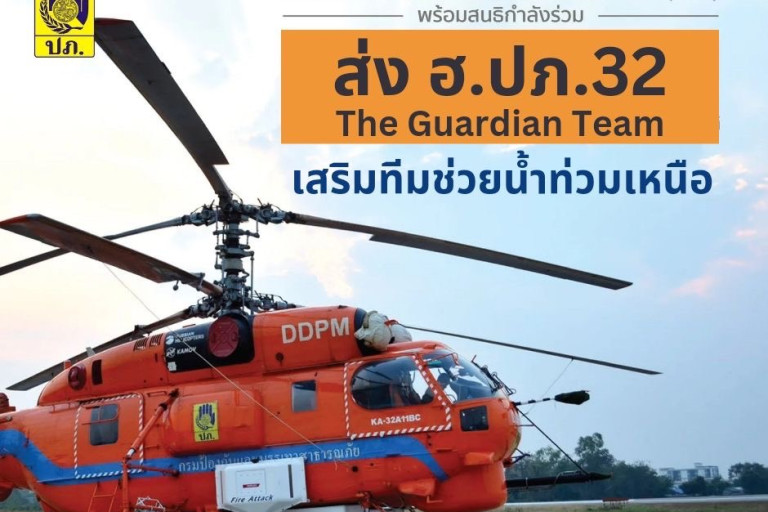 ปภ.-ทบ. สนธิกำลังส่งเฮลิคอปเตอร์ KA-32 และเจ้าหน้าที่กู้ภัยประจำ ฮ.ปภ.32 "The Guardian Team" เสริมทีมช่วยน้ำท่วมภาคเหนือ