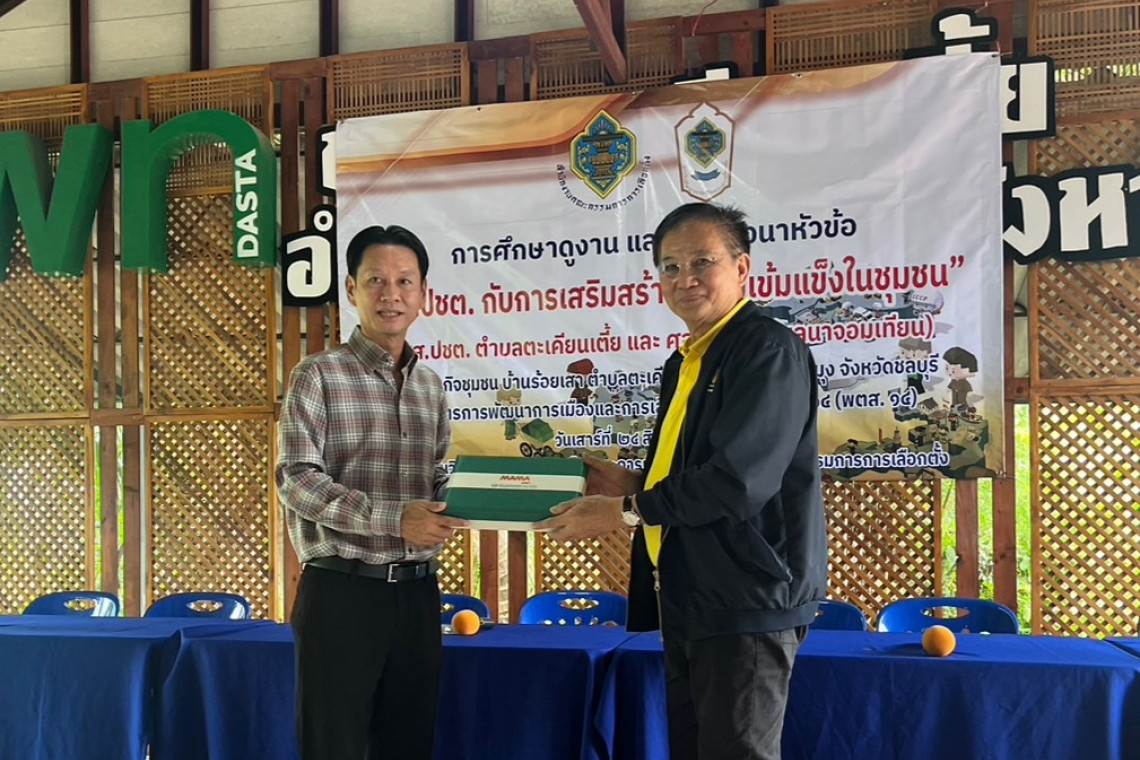 ในวันที่ 24 สิงหาคม 2567 ศาสตราจารย์สันทัด ศิริอนันต์ไพบูลย์ มอบของที่ระลึกขอบคุณแก่ นายอำนาจ เจริญศรี รองผู้ว่าราชการจังหวัดชลบุรี ที่ได้ให้เกียรติมากล่าวต้อนรับคณะผู้เข้ารับการศึกษาอบรมหลักสูตรการพัฒนาการเมืองและการเลือกตั้ง รุ่นที่ 14 (พตส. 14) ในการศึกษาดูงานและร่วมเสวนา หัวข้อ “ศส.ปชต.กับการเสริมสร้างความเข้มแข็งในชุมชน” ณ วิสาหกิจชุมชนท่องเที่ยวตำบลตะเคียนเตี้ย (บ้านร้อยเสา) ตำบลตะเคียนเตี้ย อำเภอบางละมุง จังหวัดชลบุรี