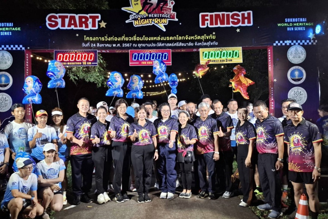 วันที่ 24 ส.ค.67 ณ อุทยานประวัติศาสตร์ศรีสัชนาลัย อำเภอ ศรีสัชนาลัย จังหวัดสุโขทัย นางสาว สรินรัตน์ เกิดสกุลรุ่งโรจน์ รองผู้ว่าราชการจังหวัดสุโขทัย ได้มาเป็นประธานการจัดงาน วิ่งท่องเที่ยวเชื่อมโยงแหล่งมรดกโลกจังหวัดสุโขทัย ครั้งที่1 กิจกรรมวิ่งท่องเที่ยวกลางคืน (NIGHT RUN) โดยนางปวีณวรรณ นิลกำแหง ท่องเที่ยวและกีฬาจังหวัดสุโขทัย ได้กล่าวรายงานว้ตถุประสงค์การจัดงาน เพื่อส่งเสริมและการยกระดับกิจกรรมการท่องเที่ยวจังหวัดสุโขทัยส่งเสริมภาพลักษณ์ การเป็นเมืองมรดกโลก ประชาสัมพันธ์ แหล่งท่องเที่ยว กระตุ้นกระแสการท่องเที่ยว สร้างรายได้ให้กับชุมชนและผู้ประกอบการท่องเที่ยวจังหวัดสุโขทัยสนับสนุนการรักษาสุขภาพและการออกกำลังกาย
