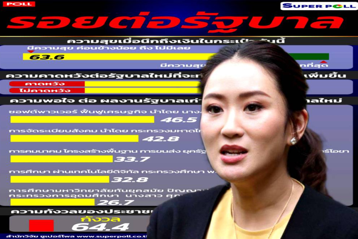 ซูเปอร์โพล ชี้ “รอยต่อรัฐบาล” คนไทยกระเป๋าแห้ง ขณะที่ผลงาน พอใจ ”อุ๊งอิ๊งค์” ชูซอฟต์พาวเวอร์ “อนุทิน” ตามติด จัดระเบียบสังคม ยังไม่ลืม“ลุงตู่” ปลื้มงานคมนาคม