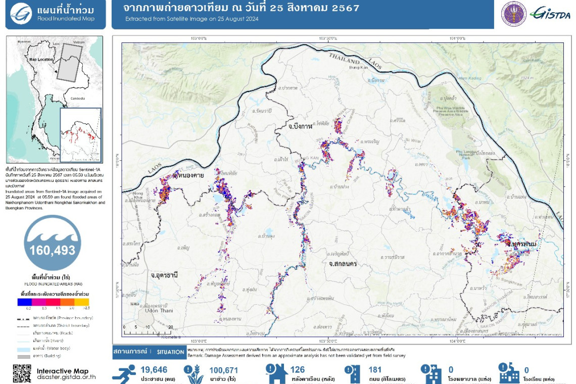 กระทรวงการอุดมศึกษา วิทยาศาสตร์ วิจัยและนวัตกรรม (อว.) โดยสำนักงานพัฒนาเทคโนโลยีอวกาศและภูมิสารสนเทศ หรือ GISTDA ใช้ข้อมูลจากภาพดาวเทียม Sentinel-1A ของวันที่ 25 สิงหาคม 2567 เวลา 05.59 น. ติดตามสถานการณ์พื้นที่น้ำท่วม พบจังหวัดที่มีพื้นที่น้ำท่วมขังบางส่วนของจังหวัด #นครพนม 40,689 ไร่ #อุดรธานี 35,227 ไร่ #หนองคาย 30,024 ไร่ #สกลนคร 29,234 ไร่ #บึงกาฬ 25,320 ไร่รวมพื้นที่ประมาณ 160,493 ไร่ โดยเป็นพื้นที่ปลูกข้าว 100,671 ไร่ (ข้อมูลพื้นที่ปลูกข้าวจากดาวเทียม ณ วันที่ 16 สิงหาคม 2567) โดยพื้นที่ที่พบส่วนใหญ่เป็นพื้นที่ลุ่มต่ำ พื้นที่การเกษตร พื้นที่ริมสองฝั่งแม่น้ำสายหลักและสายรอง รวมถึงชุมชนที่อยู่อาศัยและเส้นทางคมนาคมบางส่วน