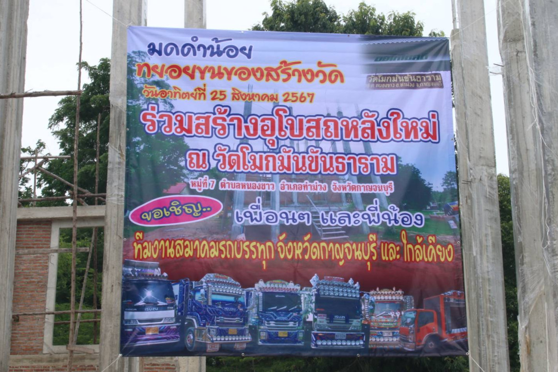 ผู้สื่อข่าวรายงานว่าเมื่อวันที่ 25 ส.ค. 2567 ที่ผ่านมา สมาคมรถบรรทุกในพื้นที่จังหวัดกาญจนบุรีและพื้นที่ทั่วภาค 7 เกือบ 100 คัน มีทั้งรถสิบล้อพ่วง หกล้อ รถกระบะ และรถแบ๊กโฮ รถไถ ได้รวมตัวกันบรรทุก หิน ปูน ทราย เหล็ก อุปกรณ์การก่อสร้างมุ่งหน้าไปยัง วัดโมกมันขันธาราม ตั้งอยู่หมู่ที่ 7 ตำบลหนองขาว อำเภอท่าม่วง จังหวัดกาญจนบุรี เพื่อนำสิ่งของและอุปกรณ์ดังกล่าวไปมอบแก่ พระอธิการโชค สิริคุตโต เจ้าอาวาส วัดโมกมันขันธาราม เพื่อร่วมก่อสร้างพระอุโบสถที่ก่อสร้างค้างมานานหลายปีให้สำเร็จลุล่วง