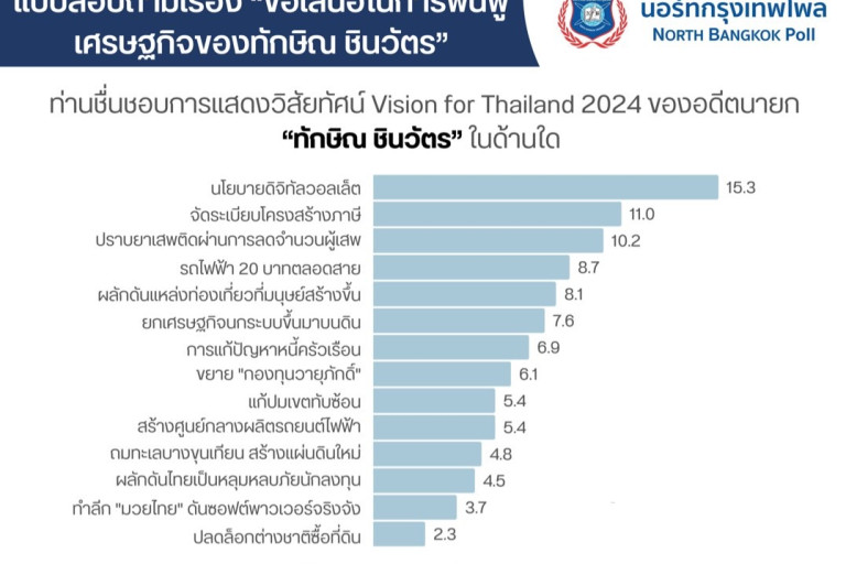 ทั้งนี้แนวทางการฟื้นฟูเศรษฐกิจ ของนายทักษิณ ชินวัตร อดีตนายกรัฐมนตรี ที่ได้แสดงวิสัยทัศน์ Vision for Thailand 2024 ประกอบไปด้วย 14 ประเด็นที่เป็นข้อเสนอแนะ โดยหากเรียงตามความชื่นชอบและให้ความสนใจมากสุด ของประชาชนชาวไทยที่ได้ทำการสำรวจทั้งหมดพบว่า อันดับที่ 1. เป็นนโยบายดิจิทัลวอลเล็ต 15.3% อันดับที่ 2. จัดระเบียบโครงสร้างภาษี 11% อันดับที่ 3.ปราบยาเสพติดผ่านการลดจำนวนผู้เสพ 10.2% อันดับที่ 4. รถไฟฟ้า 20 บาทตลอดสาย 8.7% อันดับที่ 5. ผลักดันแหล่งท่องเที่ยวที่มนุษย์สร้างขึ้น 8.1% อันดับที่ 6.ยกเศรษฐกิจนอกระบบขึ้นมาบนดิน 7.6 %
