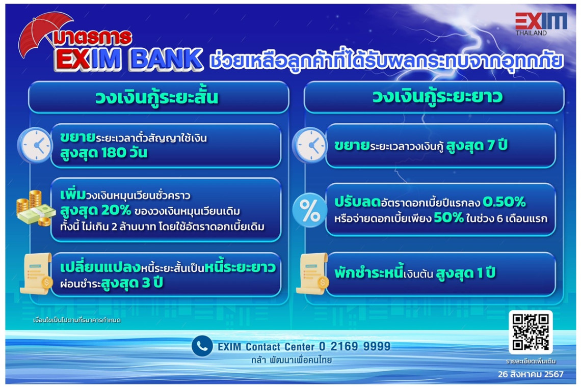 ดร.รักษ์ วรกิจโภคาทร กรรมการผู้จัดการ ธนาคารเพื่อการส่งออกและนำเข้าแห่งประเทศไทย (EXIM BANK) เปิดเผยว่า EXIM BANK มีมาตรการช่วยเหลือและเยียวยาลูกค้าที่ได้รับผลกระทบทั้งทางตรงและทางอ้อมจากสถานการณ์อุทกภัยในพื้นที่ภาคเหนือของไทย ทั้งในส่วนของวงเงินกู้ระยะสั้นและวงเงินกู้ระยะยาว โดยเพิ่มวงเงินทุนหมุนเวียนระยะสั้นชั่วคราวสูงสุด 20% ของวงเงินเดิม เปลี่ยนแปลงภาระหนี้ระยะสั้นเป็นภาระหนี้ระยะยาว ผ่อนชำระเงินกู้ระยะสั้นได้นานสูงสุด 3 ปี และระยะยาวสูงสุด 7 ปี ลดภาระดอกเบี้ยเงินกู้ระยะยาว และพักชำระหนี้เงินต้นนานสูงสุด 1 ปี เพื่อให้ลูกค้าของ EXIM BANK สามารถดำเนินธุรกิจส่งออกหรือธุรกิจที่เกี่ยวเนื่องกับการส่งออกตลอดทั้ง Supply Chain ได้อย่างต่อเนื่อง