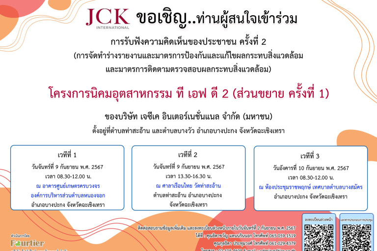 ทั้งนี้บริษัทจึงขอเชิญผู้มีส่วนเกี่ยวข้องเข้าร่วมประชุมในวันที่ 9 กันยายน.2567เวลา 08.30-12.00 น.อาคารศูนย์เกษตรครบวงจร อบต.หนองจอก อ.บางปะกง เวลา 13.30- 16.30น.ศาลาเรือนไทยวัดท่าสะอ้าน อ.บางปะกง และวันอังคารที่ 10 สิงหาคม 2567 เวลา 08.30-12.00 น.ห้องประชุมราชพฤกษ์เทศบาลตำบลบางสมัคร อ.บางปะกง จ.ฉะเชิงเทราทั้งนี้การนืคมจึงแขอเชิญผู้สนใจเข้าร่วมประชุมการรับฟัง ความคิดเห็นของประชาชนครั้งที่ 2 ในการรับฟังความคิดเห็นต่อการจัดทำร่างรายงานและมาตรการป้องกันและแก้ไขผลกระทบสิ่งแวด ล้อม และมาตรการติดตามตรวจสอบผลกระทบสิ่งแวดล้อม โครงการนิคมอุตสาหกรรม ที เอฟ ดี 2 (ส่วนขยาย ครั้งที่ 1) ของบริษัท เจซีเค อินเตอร์เนชั่นแนล จำกัด (มหาชน)