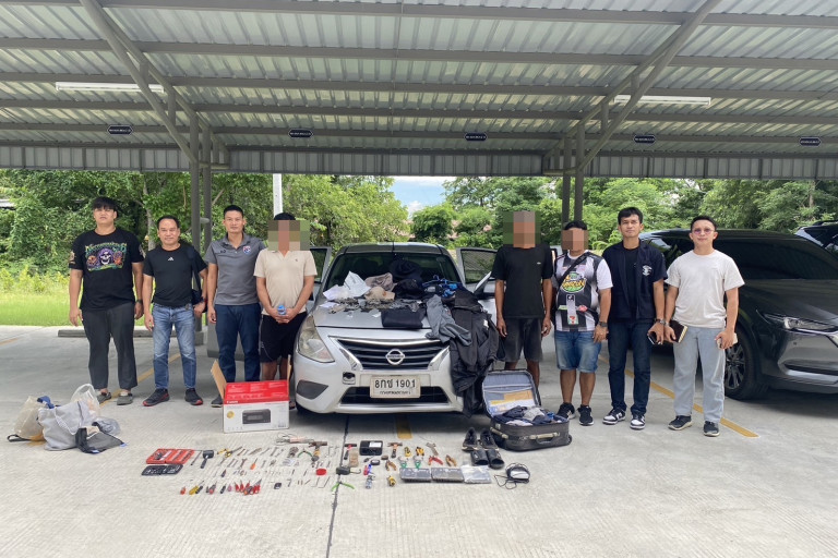 กลางซึ่งเป็นอุปกรณ์ที่เกี่ยวข้องกับการลักรถยนต์ ดังนี้1. รถยนต์ยี่ห้อนิสสัน รุ่นอมีร่า สีเทา ทะเบียน 8กช-1907 กทม. ที่ใช้ตระเวนก่อเหตุ , 2. กล่อง ECU จำนวน 3 กล่อง เป็นสมองกลซึ่งรถโตโยต้า รุ่นรีโว่ จะมีอยู่ในรถ ซึ่งหากข้อมูลของกุญแจกับกล่อง ECU ไม่ตรงกัน จะไม่สามารถสตาร์ตรถได้ คนร้ายจึงได้เตรียมกล่อง ECU ไว้เพื่อเปลี่ยน แล้วใช้อุปกรณ์ในการงัดแงะเพื่อใช้สตาร์ตรถออกไปส่งประเทศเพื่อนบ้าน, 3. อุปกรณ์สะเดาะกุญแจ,4. อุปกรณ์คัดลอกกุญแจ, 5. กล่องอุปกรณ์ช่าง 2 กล่อง
