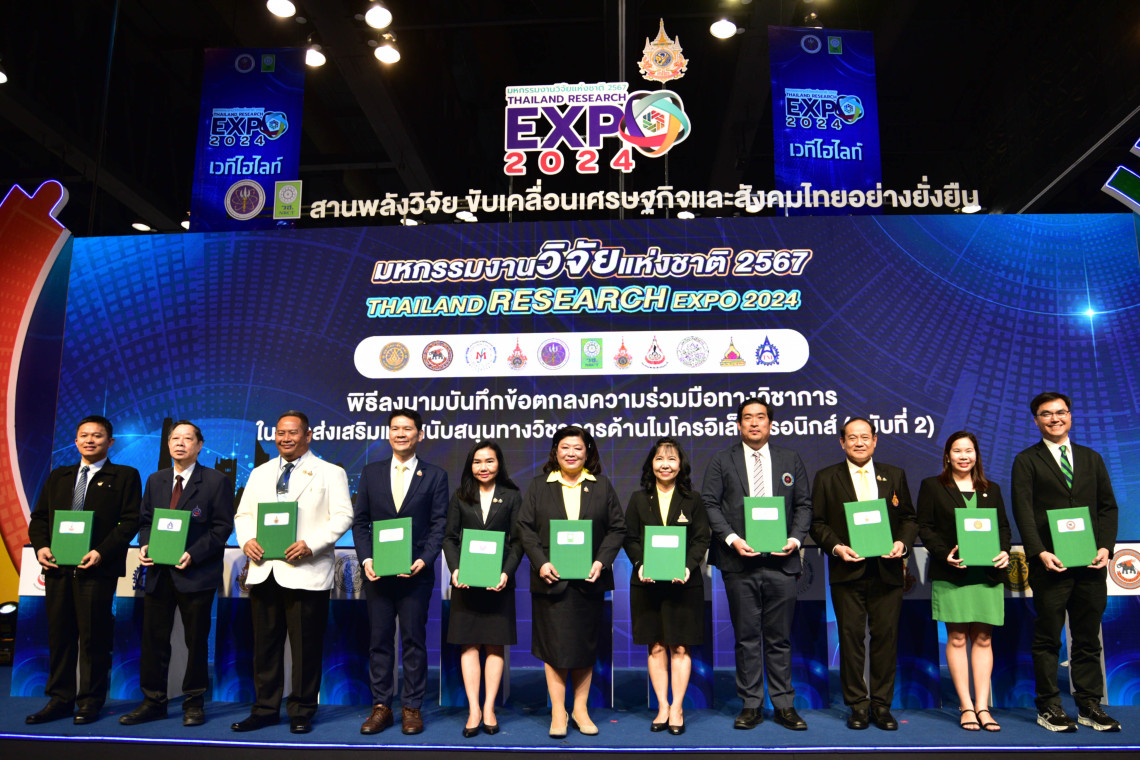 สำนักงานการวิจัยแห่งชาติ (วช.) กระทรวงการอุดมศึกษา วิทยาศาสตร์ วิจัยและนวัตกรรม ลงนามบันทึกข้อตกลงความร่วมมือทางวิชาการในการส่งเสริมและสนับสนุนทางวิชาการด้านไมโครอิเล็กทรอนิกส์ (ฉบับที่ 2) ร่วมกับภาคีเครือข่าย 11 แห่ง ได้แก่ สำนักงานปลัดกระทรวงการอุดมศึกษา วิทยาศาสตร์ วิจัยและนวัตกรรม มหาวิทยาลัยเทคโนโลยีมหานคร มหาวิทยาลัยเทคโนโลยีราชมงคลธัญบุรี มหาวิทยาลัยเทคโนโลยีราชมงคลอีสาน มหาวิทยาลัยเทคโนโลยีสุรนารี มหาวิทยาลัยนเรศวร มหาวิทยาลัยบูรพา มหาวิทยาลัยศิลปากร มหาวิทยาลัยอุบลราชธานี และ สถาบันเทคโนโลยีไทย-ญี่ปุ่น เพื่อสนับสนุนความรู้ทางวิชาการด้านไมโครอิเล็กทรอนิกส์มุ่งสู่ศูนย์กลางแห่งเมืองแห่งอุตสาหกรรมโลก ในงาน “มหกรรมงานวิจัยแห่งชาติ 2567” (Thailand Research Expo 2024) ภายใต้แนวคิด “สานพลังวิจัย ขับเคลื่อนเศรษฐกิจและสังคมไทยอย่างยั่งยืน” โดยมี ดร.วิภารัตน์ ดีอ่อง ผู้อำนวยการสำนักงานการวิจัยแห่งชาติ กล่าวต้อนรับ ณ เวทีกิจกรรม Highlight Stage ห้องบางกอกคอนเวนชันเซ็นเตอร์ ชั้น 22 โรงแรมเซ็นทาราแกรนด์ และบางกอกคอนเวนชันเซ็นเตอร์ เซ็นทรัลเวิลด์ กรุงเทพฯ
