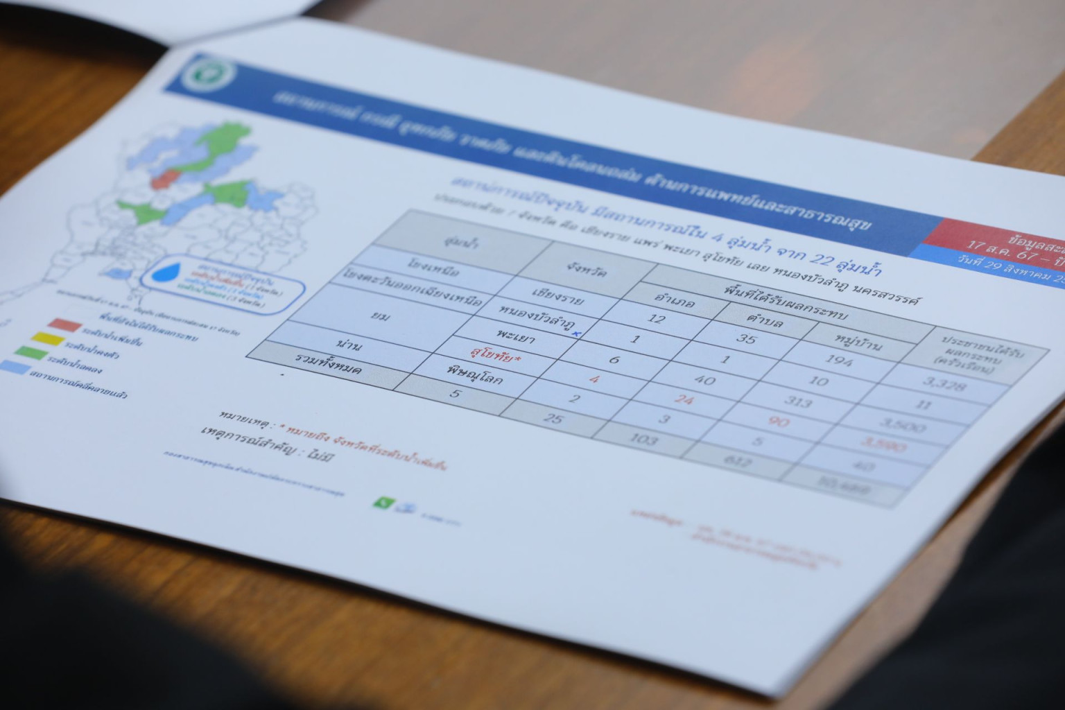 โดยนายสมศักดิ์ เปิดเผยว่า ที่ประชุมได้มีการรายงานสถานการณ์และผลกระทบด้านการแพทย์จากเหตุอุทกภัยและดินโคลนถล่ม ซึ่งขณะนี้ มีผู้เสียชีวิตแล้ว 29 ราย บาดเจ็บ 40 ราย สูญหาย 1 ราย โดยสาเหตุของการเสียชีวิต ส่วนใหญ่จากเหตุดินถล่ม ส่วนสถานบริการสาธารณสุข ที่ได้รับผลกระทบ ขณะนี้มีจำนวน 30 แห่ง ซึ่งเปิดได้ตามปกติ 25 แห่ง และปิด 5 แห่ง โดยสถานบริการสาธารณสุขที่ปิดทั้งหมดอยู่ในจังหวัดแพร่ แบ่งเป็น สสอ. 1 แห่ง คือ สสอ.เมืองแพร่ และ รพ.สต. 4 แห่ง คือ รพ.สต.น้ำโค้ง รพ.สต.วังธง รพ.สต.สบสาย และรพ.สต.ปงพร้าว ซึ่งที่ปิดทั้งหมดคาดว่า จะเปิดให้บริการได้ตามปกติวันที่ 2 ก.ย.นี้ ส่วนการช่วยเหลือของกระทรวงสาธารณสุข ได้มีการเปิดศูนย์ปฏิบัติการฉุกเฉินด้านการแพทย์และสาธารณสุข จำนวน 5 แห่ง คือ เชียงราย น่าน แพร่ พะเยา และสุโขทัย โดยมีการดูแลประชาชนกลุ่มเปราะบางแล้ว แบ่งเป็น ผู้ป่วยติดเตียง 457 ราย หญิงตั้งครรภ์ 10 ราย และผู้พิการ 4 ราย