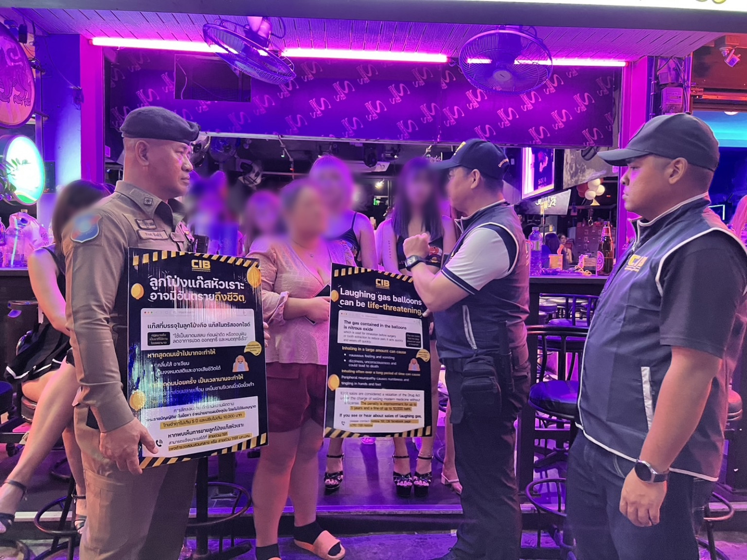 โดยกำลังเจ้าหน้าที่กว่า 20 นาย เดินเท้าเข้าตรวจสอบสถานบันเทิงกลุ่มผับบาร์เบียร์ เน้นร้านที่มีการตกแต่งด้วยลูกโป่ง โดยใช้ป้ายทั้งภาษาไทยและภาษาอังกฤษ ประชาสัมพันธ์ชี้แจง ให้ผู้ประกอบการห้ามลักลอบจำหน่ายลูกโป่งที่บรรจุแก๊สไนรตรัสออกไซด์ ให้นักท่องเที่ยวใช้สูดดมเด็ดขาด