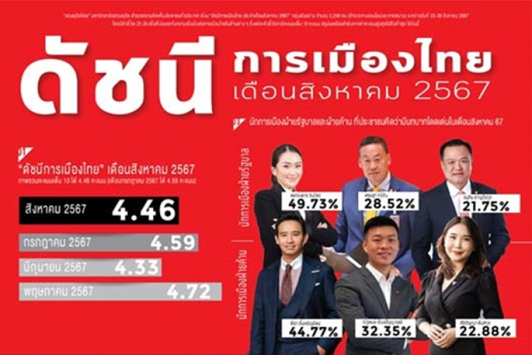 1. “ดัชนีการเมืองไทย” เดือนสิงหาคม 2567 ภาพรวมคะแนนเต็ม 10 ได้ 4.46 คะแนน (เดือนกรกฎาคม 2567 ได้ 4.59 คะแนน)