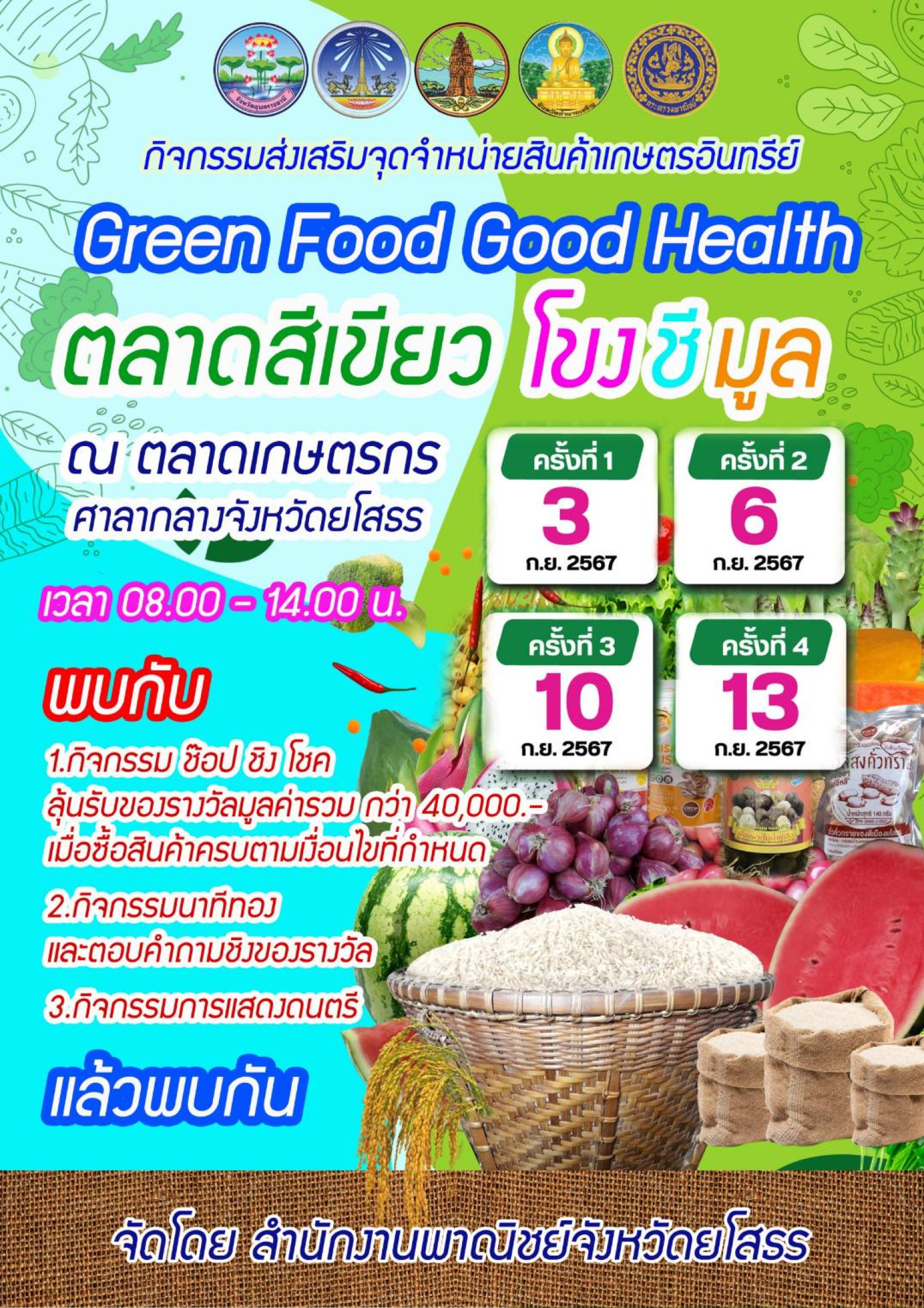 วันที่ 2 ก.ย 67 สำนักงานพาณิชย์จังหวัดยโสธร โดยนางสาวนงค์นุช อุดมคำ พาณิชย์จังหวัดยโสธร เตรียมจัดกิจกรรมส่งเสริมจุดจำหน่ายสินค้าเกษตรอินทรีย์ ตลาดสีเขียว โขง ชี มูล “Green Food Good Health” ตามโครงการส่งเสริมการตลาดสินค้าปลอดภัย และสินค้าอินทรีย์ กลุ่มจังหวัดภาคตะวันออกเฉียงเหนือตอนล่าง 2 จำนวนทั้งสิ้น 4 วัน คือวันที่ 3 , 6 , 10 และ 13 กันยายน 2567ที่สนามหน้าศาลากลางจังหวัดยโสธร