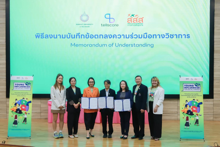 เมื่อวันที่ 29 สิงหาคม 2567 ที่มหาวิทยาลัยรังสิต สำนักงานกองทุนสนับสนุนการสร้างเสริมสุขภาพ (สสส.) ร่วมกับ มหาวิทยารังสิต และบริษัท เทลสกอร์ จำกัด จัดพิธีลงนามบันทึกข้อตกลงความร่วมมือทางวิชาการ (MOU) เดินหน้าพัฒนาหลักสูตรวิชาอินฟลูเอนเซอร์เพื่อเปลี่ยนแปลงสังคม ผ่านการอบรมภายใต้โครงการ Young Influencer for Social Change หวังให้เยาวชนคนรุ่นใหม่ตื่นตัวใช้พลังโซเชียลขับเคลื่อนสังคมสุขภาวะ