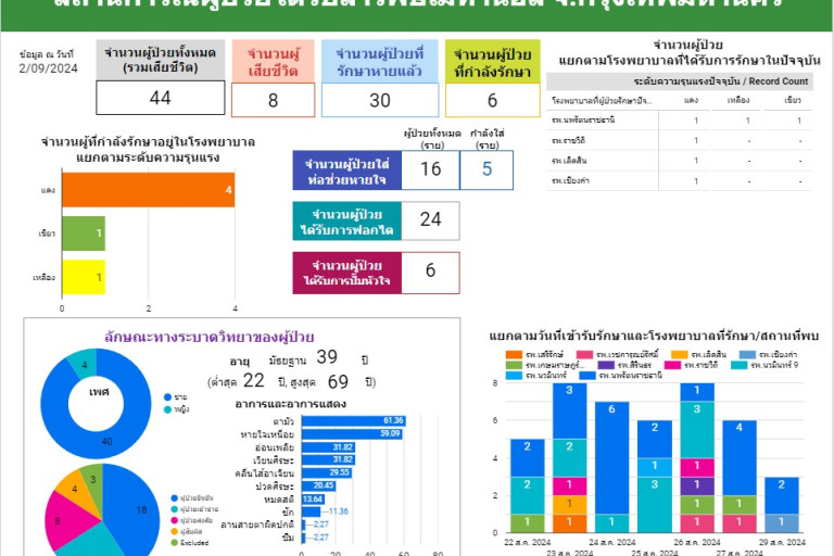 วันที่ 2 กันยายน 2567 สถิติสถานการณ์ผู้ป่วยได้รับสารพิษเมทานอล กรุงเทพมหานคร จากกรมการแพทย์ และกรมควบคุมโรค กระทรวงสาธารณสุข ระบุว่า จำนวนผู้ป่วยทั้งหมด รวม 44 ราย เสียชีวิตเพิ่มอีก 1 ราย เป็น 8 ราย, ผู้ป่วยที่กำลังรักษาตัว เหลือ 6 ราย และรักษาหายแล้ว 30 ราย อยู่ระหว่างกำลังใส่ท่อช่วยหายใจ 5 ราย แบ่งผู้ป่วยตาม รพ.ดังนี้ รพ.นพรัตนราชธานี (สีแดง) 1 ราย (สีเหลือง) 1 ราย และ(สีเขียว) 1 ราย, รพ.ราชวิถี (สีแดง) 1 ราย, รพ.เลิดสิน (สีแดง) 1 ราย, รพ.เชียงคำ (สีแดง) 1ราย สำหรับผู้เสียชีวิตรายล่าสุดเสียชีวิตที่รพ.เกษมราษฎร์ รามคำแหง เป็นผู้ป่วยเดิมที่อาการหนักตั้งแต่แรกที่เข้ารับการรักษา