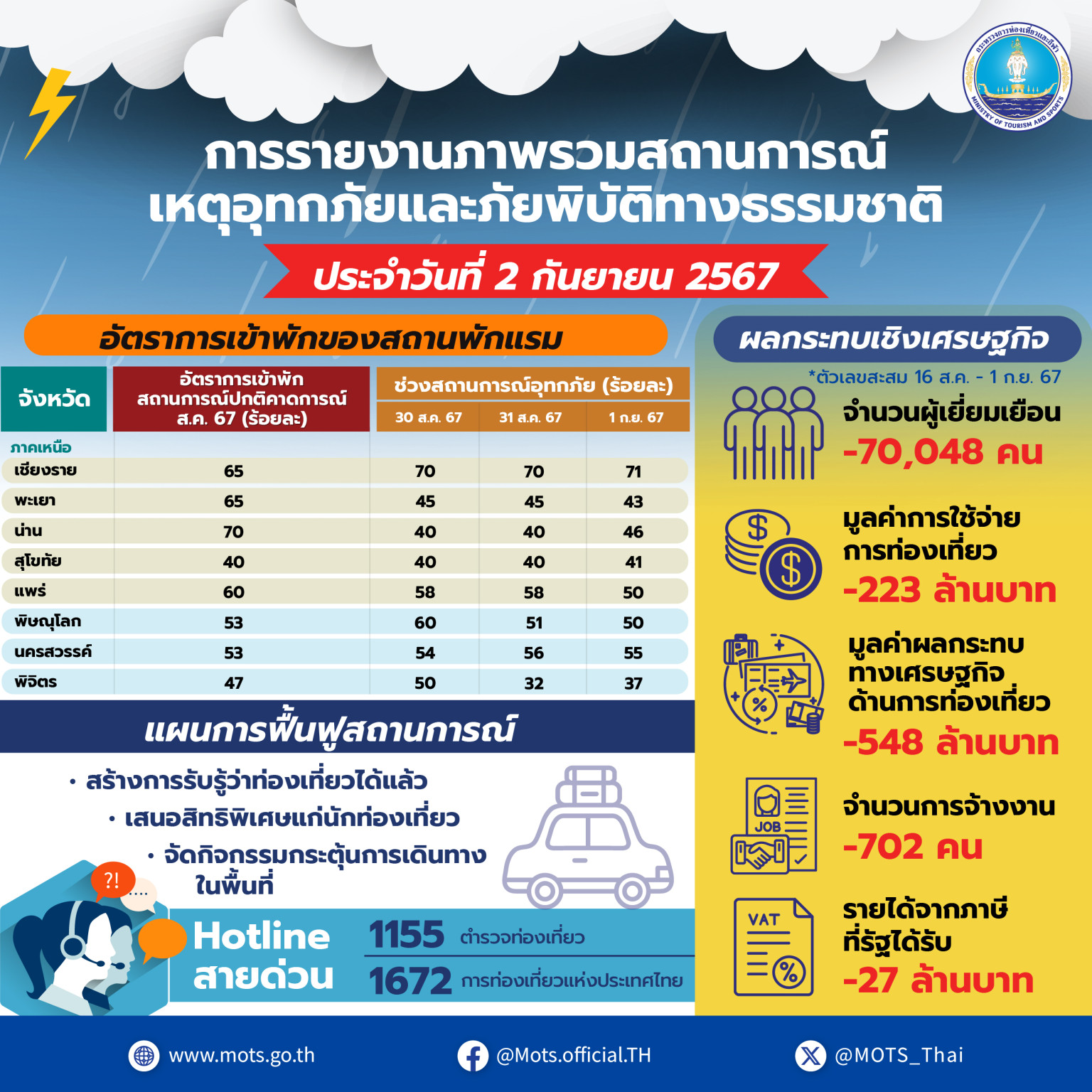 สำหรับสถานการณ์น้ำท่วมในหลายพื้นที่เริ่มคลี่คลายลงอย่างชัดเจน การท่องเที่ยวในพื้นที่สำคัญ เช่น เชียงราย น่าน แพร่ พิษณุโลก สุโขทัย และเชียงใหม่ ได้กลับเข้าสู่ภาวะปกติแล้ว นักท่องเที่ยวสามารถเดินทางและเพลิดเพลินกับการท่องเที่ยวได้ตามปกติ