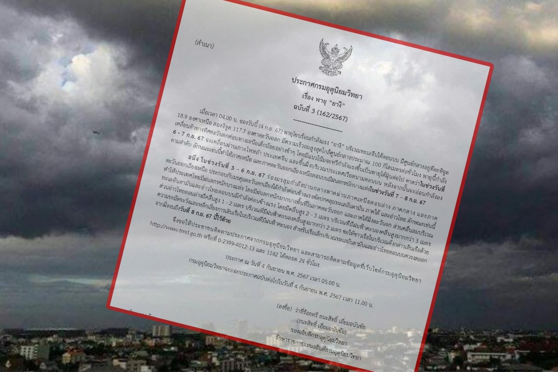 วันที่ 4 ก.ย.67 ว่าที่ ร.ต.ธนะสิทธิ์ เอี่ยมอนันชัย รองอธิบดีกรมอุตุนิยมวิทยา รักษาราชการแทนอธิบดีกรมอุตุนิยมวิทยา ออกประกาศกรมอุตุนิยมวิทยา เรื่อง พายุ “ยางิ” ฉบับที่ 3 (162/2567) ระบุว่า...