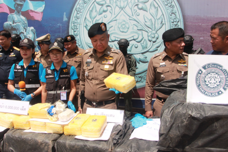 เมื่อเวลา 11.00 น.วันที่ 4 กันยายน 2567 ที่กองบังคับการตำรวจภูธรจังหวัดเชียงราย พล.ต.ท.กฤตธาพล ยี่สาคร ผู้บัญชาการตำรวจภูธรภาค 5 พล.ต.ต. มานพ เสนากูล ผู้บังคับการตรวจภูธรจังหวัดเชียงราย พ.ต.อ.ถนัด ชุ่มมะโน ผู้กำกับการสถานีตำรวจภูธรเชียงแสน และหน่วยงานที่เกี่ยวข้อง ได้ร่วมกันแถลงผลการจับกุมขบวนการค้ายาเสพติดได้ผู้ต้องหา 6 คน คือ นายณรงค์เดช (สงวนนามสกุล) นายพงษ์ศักดิ์ (สงวนนามสกุล) นายอยุธยา (สงวนนามสกุล) นายกิตติ (สงวนนามสกุล) นายเสถียร (สงวนนามสกุล) ชาว อำเภอเวียงแก่น จังหวัดเชียงราย และนายคี (สงวนนามสกุล) ชาวอำเภอเทิง จังหวัดเชียงราย ในข้อกล่าวหา ร่วมกันมียาเสพติดให้โทษประเภท 1 (เมทแอมเฟตามีนหรือยาบ้า) โดยการมีไว้เพื่อการค้า โดยไม่ได้รับอนุญาตเพื่อการค้าและเป็นการก่อให้เกิดการแพร่กระจายในหมู่ประชาชน และทำให้เกิดผลกระทบต่อความมั่นคงของรัฐหรือความปลอดภัยของประชาชนทั่วไป พร้อมยึดของกลางเป็นยาบ้าจำนวน 30 กระสอบ รวมยาบ้า ทั้งสิ้น 6,000,000 เม็ด รถยนต์ที่ใช้ลำเลียง 2 คัน และรถจักรยายนต์อีก 1 คัน