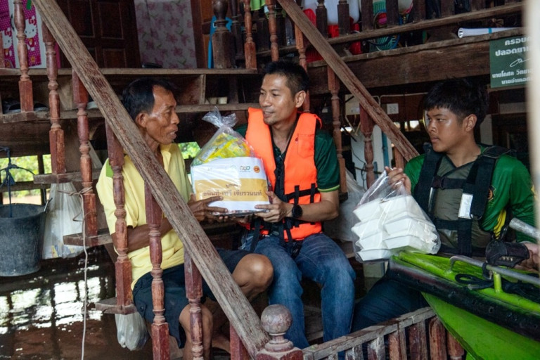 นายภูริทัศน์ พอใจ พนักงานจิตอาสา ซีพีเอฟ เล่าว่า น้ำท่วมครั้งนี้ นับว่ารุนแรงและสร้างความเสียหายเป็นวงกว้าง ขณะลงพื้นที่ได้เห็นถึงความยากลำบากของผู้ประสบภัย บางจุดน้ำท่วมสูงมากกว่า 2 เมตร เกือบถึงชั้นสองของบ้าน จำเป็นต้องใช้เรือในการเดินทาง บางหลังมีผู้สูงอายุอยู่เพียงลำพัง เพื่อนบ้านต้องช่วยดูแล หาอาหารประทังชีวิตในแต่ละมื้อ