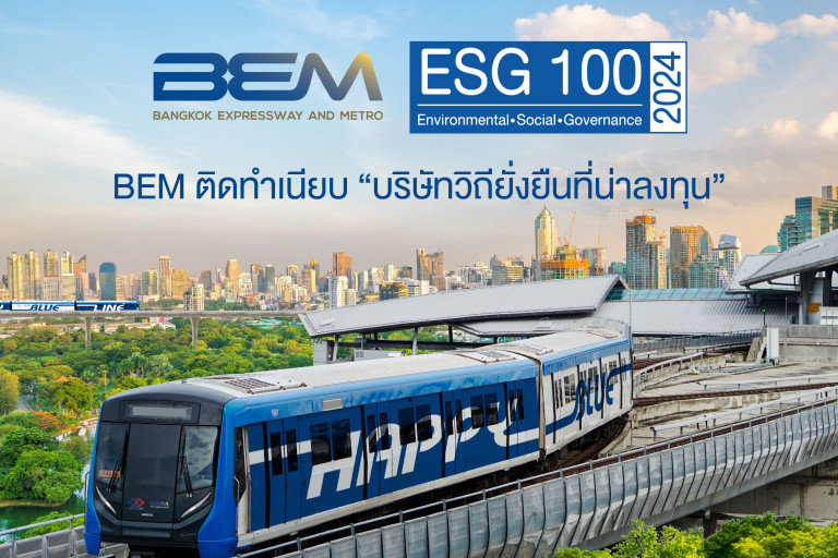 บริษัท ทางด่วนและรถไฟฟ้ากรุงเทพ จำกัด (มหาชน) หรือ BEM ได้รับคัดเลือกจากสถาบันไทยพัฒน์ให้เข้าอยู่ในทำเนียบ “บริษัทวิถียั่งยืนที่น่าลงทุน” ซึ่งเป็นหลักทรัพย์ใน Universe ของกลุ่มหลักทรัพย์ ESG100 ประจำปี 2567 ในฐานะบริษัทที่มีการดำเนินงานโดดเด่นด้านสิ่งแวดล้อม สังคม และธรรมาภิบาล (Environmental, Social and Governance: ESG) ในกลุ่มธุรกิจขนส่งและโลจิสติกส์
