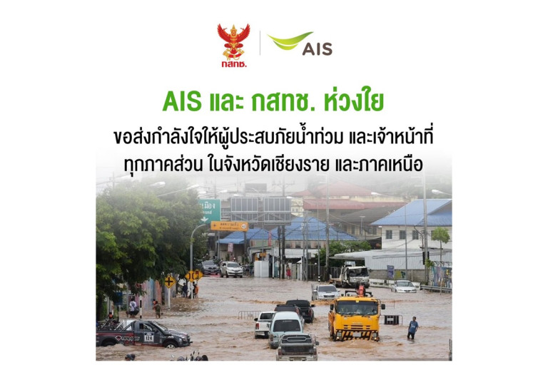 AIS และ กสทช.ส่งความห่วงใยผู้ประสบภัยน้ำท่วมเชียงรายและภาคเหนือ ขยายวันใช้งานและขยายเวลาชำระค่าบริการมือถือ เน็ตบ้าน พร้อมเร่งลงพื้นที่ดูแลเครือข่ายเต็มกำลัง