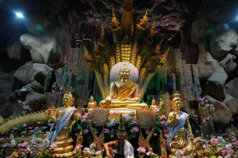 ขณะที่ วัดมณีวงศ์ ตั้งอยู่ตำบลดงละคร มีไฮไลท์ คือ วังรัตนมณีมหานครบาดาลนาคราชหรือวังพญานาค โดยด้านหน้าทางเข้าอาคารเป็นที่ตั้งของถ้ำจะพบกับสะพานเป็นประติมากรรมปูนปั้นที่จำลองการข้ามห้วงนรก ตัวสะพานจะเป็นพญานาคห้าเศียรพร้อมองค์พญานาคจำแลงที่อยู่ในสระบัวภายในวังพญานาค และศักการะพระรัตนมณีมหาบาดาล พระพุทธรูปองค์ใหญ่สีทองอร่ามประดิษฐานท่ามกลางเหล่าพญานาคที่มีความสวยงามเป็นอย่างมาก