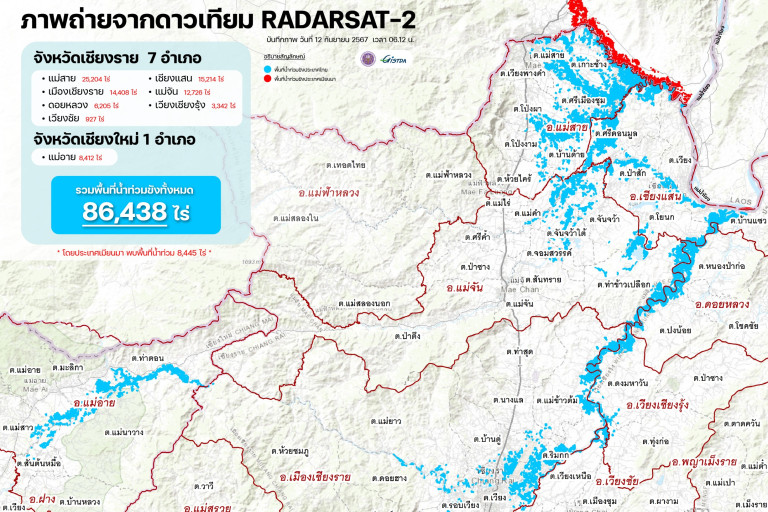 กระทรวงการอุดมศึกษา วิทยาศาสตร์ วิจัยและนวัตกรรม (อว.) โดยสำนักงานพัฒนาเทคโนโลยีอวกาศและภูมิสารสนเทศ หรือ GISTDA ติดตามสถานการณ์น้ำท่วมจากภาพดาวเทียม RADARSAT-2 ของวันที่ 12 กันยายน 2567 เวลา 06.12 น. พบน้ำท่วมขังใน 7 อำเภอของจังหวัดเชียงราย ได้แก่ #แม่สาย 25,204 ไร่ #เชียงแสน 15,214 ไร่ #เมืองเชียงราย 14,408 ไร่ #แม่จัน 12,726 ไร่ #ดอยหลวง 6,205 ไร่ #เวียงเชียงรุ้ง 3,342 ไร่ และ #เวียงชัย 927 ไร่ ในขณะที่จังหวัดเชียงใหม่พบพื้นที่น้ำท่วมขัง 1 อำเภอ คือ #แม่อาย 8,412 ไร่ รวมพื้นที่น้ำท่วมขังทั้งหมด 86,438 ไร่ จากภาพจะเห็นได้ว่าบริเวณที่เป็นพื้นที่สีแดง คือ ฝั่งประเทศเมียนมา ซึ่งพบพื้นที่น้ำท่วมขัง 8,445 ไร่ โดยปริมาณน้ำท่วมขังที่เกิดขึ้นในพื้นที่จะถูกระบายลงสู่แม่น้ำโขงต่อไป