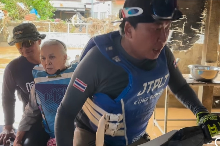จากนั้นเปิ้ล นาครก็นำขูชึพสวมใส่ให้คุณยาย แบ้วบอกยายว่า เกาะชูชึพนะ ถ้าตกน้ำ เรือคว่ำ ยายไม่ต้องตกใจนะ ยายก็เกาะชูชีพไปเรื่อยๆ จากนั้นเปิ้ล นาคร ก็ขึ้นเจ็ตสกีขับพาคุณยายออกจากพื้นที่ไป