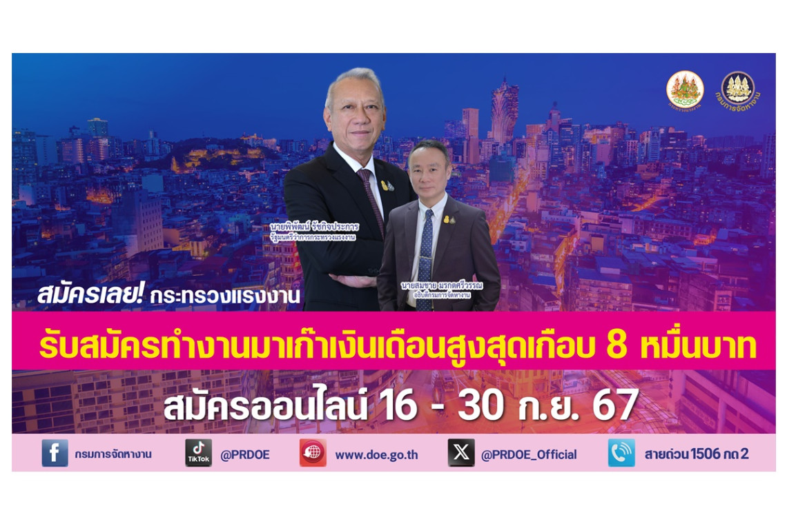 เมื่อวันที่ 13 ก.ย.67 นายพิพัฒน์ รัชกิจประการ รัฐมนตรีว่าการกระทรวงแรงงาน เปิดเผยว่า กระทรวงแรงงาน โดยกรมการจัดหางาน เปิดรับสมัครคนหางานเพื่อไปทำงานในเขตบริหารพิเศษมาเก๊ากับนายจ้างบริษัท Galaxy Entertainment Group ซึ่งประกอบกิจการโรงแรม คาสิโน และร้านอาหาร จำนวน 6 ตำแหน่ง รวม 28 อัตรา ได้แก่ พนักงานต้อนรับลูกค้าวีไอพี พนักงานจัดดอกไม้ กัปตัน พนักงานฝ่ายต้อนรับวีไอพี พนักงานนวด พนักงานเสิร์ฟ อัตราเงินเดือนอยู่ระหว่าง 50,636 – 79,256 บาท (อัตราแลกเปลี่ยนเงินวันที่ 30 สิงหาคม 2567) โดยนายจ้างจะจ่ายค่าโดยสารเครื่องบินไป - กลับ ช่วยจ่ายค่าที่พักเดือนละ 500 เหรียญมาเก๊า จัดอาหารในช่วงเวลาทำงาน มีประกันสุขภาพ และสวัสดิการตามที่กฎหมายแรงงานมาเก๊ากำหนด ผู้สนใจสามารถสมัครทางเว็บไซต์ toea.doe.go.th โดยลงทะเบียนระบบอิเล็กทรอนิกส์การบริหารแรงงานไทยไปต่างประเทศ กรอกข้อมูลเพื่อลงทะเบียนคนหางาน และดำเนินการสมัครไปทำงาน เลือกหัวข้อ “สมัครไปทำงานโดยรัฐจัดส่ง” และเลือกรายการ “การรับสมัครคนหางานเพื่อไปทำงานในเขตบริหารพิเศษมาเก๊ากับนายจ้างบริษัท Galaxy Entertainment Group (ครั้งที่ 3/2567)” สมัครได้ตั้งแต่วันที่ 16 – 30 กันยายน 2567 ตลอด 24 ชั่วโมง ไม่เว้นวันหยุดราชการ (ยกเว้นในวันที่ 30 กันยายน 2567 ยื่นใบสมัครได้ถึงเวลา 12.00 น.)