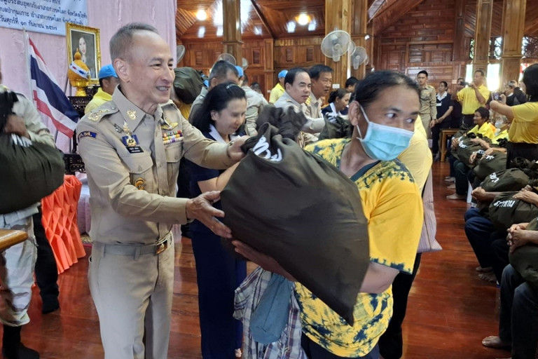พร้อมเชิญสิ่งของพระราชทานราชวิทยาลัยจุฬาภรณ์ หน้าพระรูป สมเด็จพระเจ้าน้องนางเธอ เจ้าฟ้าจุฬาภรณวลัยลักษณ์ อัครราชกุมารี กรมพระศรีสวางควัฒน วรขัตติยราชนารี มอบกับให้ผู้ประสบอุทกภัยอำเภอสวรรคโลก จังหวัดสุโขทัยโดย นายอำเภอและหัวหน้าส่วนราชการมองสิ่งของพระราชทาน ราชวิทยาลัยจุฬาภรณ์ให้ราษฎรที่ประสบเหตุอุทกภัยครบ 500 ชุด