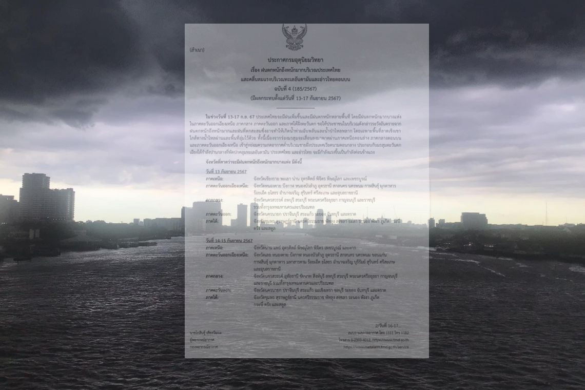 เมื่อเวลา 17.00 น.วันที่ 13 กันยายน 2567 กรมอุตุนิยมวิทยา ออกประกาศเรื่อง ฝนตกหนักถึงหนักมากบริเวณประเทศไทย และคลื่นลมแรงบริเวณทะเลอันดามันและอ่าวไทยตอนบน ฉบับที่ 4 (185/2567) (มีผลกระทบตั้งแต่วันที่ 13-17 กันยายน 2567) ดังนี้