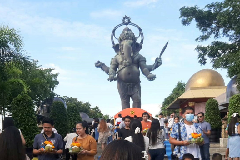 สำหรับของไหว้พระพิฆเนศ ส่วนใหญ่ เป็น นม ผลไม้ กล้วย อ้อย ซึ่งทางอุทยานฯ ได้จัดเตรียมไว้ให้ แล้วแต่จะทำบุญ หรือหากจะนำมาเองก็ได้ ตามแต่สะดวก ทั้งนี้โรคโควิต 19 หมดไปแล้วชาวบ้านนักท่องเที่ยวต่างมาไหว้ขอพระพระพิฆเนศ เทพเจ้าแห่งความสำเร็จ ที่จังหวัดฉะเชิงเทรา รับเอาสิ่งดี เข้ามาในชีวิต พิชิตอุปสรรคสู่ความสำเร็จตลอดปีและตลอดไปก่อนกลับนักท่องเที่ยวยังลาของไหว้ใส่ถุงติดมือกลับไปเป็นสิริมงคลด้วยบางคนก็บูชาองค์พระพิฆเนศกลับไปบูชาที่บ้านที่ทำงานทั้งองค์เล็ก จิ๋ว และองค์ใหญ่ บางคนถึงกลับไปผันเห็นมีโชคมีลาภ จึงกลับมาไหว้อีก บางคนก็บูชากำลัยใส่ข้อมือ บางคนต่อแถวยาวเพื่อที่จะเข้าไปเจิมหน้าผากสีแดง บางคนเจิมโทรศัพท์ กระเป๋าสตางค์ ตามความเชื่อและศรัทธา
