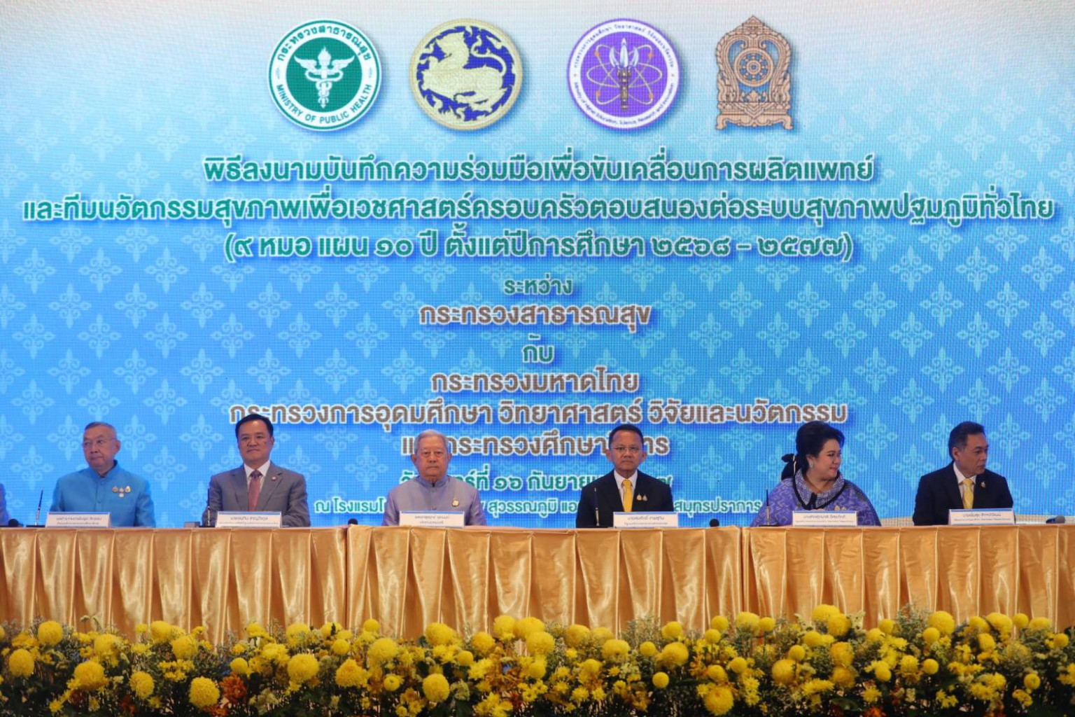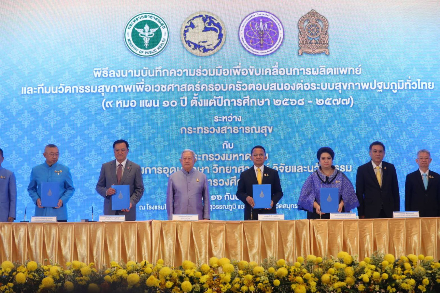 วันที่ 16 ด.ย.2567 เวลา 16.30 น. ที่โรงแรมโนโวเทล กรุงเทพ สุวรรณภูมิ แอร์พอร์ต จังหวัดสมุทรปราการ กระทรวงสาธารณสุข จัดพิธีลงนามบันทึกข้อตกลงความร่วมมือเพื่อขับเคลื่อนการผลิตแพทย์และทีมนวัตกรรมสุขภาพเพื่อเวชศาสตร์ครอบครัวตอบสนองต่อระบบสุขภาพปฐมภูมิทั่วไทย (9 หมอ) แผน 10 ปี ตั้งแต่ปี 2568 - 2577 ระหว่างกระทรวงสาธารณสุข กับ กระทรวงมหาดไทย กระทรวงการอุดมศึกษา วิทยาศาสตร์ วิจัยและนวัตกรรม และกระทรวงศึกษาธิการ โดยมี พล.อ.สุรยุทธ์ จุลานนท์ ประธานองคมนตรี เป็นประธานในพิธี มีนายสมศักดิ์ เทพสุทิน รัฐมนตรีว่าการกระทรวงสาธารณสุข นายอนุทิน ชาญวีรกูล รองนายกรัฐมนตรีและรัฐมนตรีว่าการกระทรวงมหาดไทย น.ส.ศุภมาส อิศรภักดี รัฐมนตรีว่าการกระทรวงการอุดมศึกษา วิทยาศาสตร์ วิจัยและนวัตกรรม พล.ต.อ.เพิ่มพูน ชิดชอบ รัฐมนตรีว่าการกระทรวงศึกษาธิการ ร่วมลงนาม พร้อมทั้งผู้บริหารและเจ้าหน้าที่ของทั้ง 4 กระทรวงเข้าร่วมงาน