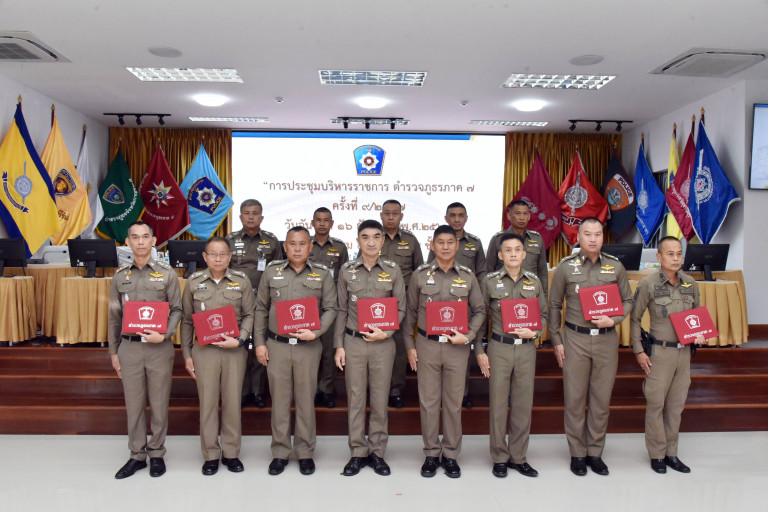 โดยมี พล.ต.ท.สำเริง สวนทอง ผู้ทรงคุณวุฒิพิเศษ ตร.รรท.รอง ผบช.ภ.7 พล.ต.ต.อาทิชา เปาอินทร์ รอง ผบช.ภ.7 พล.ต.ต.อุทัย กวินเดชาธร รอง ผบช.ภ.7 พล.ต.ต.พิพัฒน์ ชุ่มมณีกูล รอง ผบช.ภ.7 พล.ต.ต.ประสพชัย มัตสยะวนิชกูล ผบก.สส.ภ.7 พล.ต.ต.ปริดา อิ่มเจริญ ผบก.ศฝร.ภ.7 พล.ต.ต.วัชรินทร์ ประสพดี ผบก.ภ.จว.สุพรรณบุรี พล.ต.ต.จำลอง งามเนตร ผบก.ภ.จว.ประจวบครีขันธ์ พล.ต.ต.อนุรักษ์ พรพุทธศรี ผบก.กค.ภ.7พล.ต.ต.สมภพ คูหาวิชานันท์ ผบก.ภ.จว.สมุทรสงคราม พล.ต.ต.นครินทร์ สุคนธวิท ผบก.ภ.จว.กาญจนบุรี พล.ต.ต.วชิรพงย์ อมราพิทักษ์ ผบก.ภ.จว.ราชบุรี พล.ต.ต.สุวรรณ์ เชี่ยวนาวินขวัช ผบก.ภ.จว.นครปฐม พล.ต.ต.สุระพรรณ นาทวรทัต ผบก.ภ.จว.สมุทรสาคร พล.ต.ต.กิดติ สุขสมภักดิ์ ผบก.ภ.จว.เพชรบุรี พล.ต.ต.พัศวีร์ เรืองภู่ ผบก.อก.ภ.7 พร้อมรอง ผบก.ภ.จว.ทั้ง 8 จังหวัด ผกก.หัวหน้าสถานีทั้ง 104 สถานี ในสังกัดตำรวจภูธรภาค.7 และเจ้าหน้าที่ที่เกี่ยวข้องเข้าร่วมประชุม