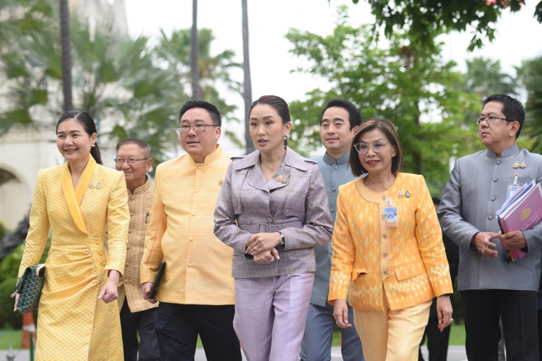 วันที่ 17 ก.ย. 2567 เมื่อเวลา 09.20 น. น.ส.แพทองธาร ชินวัตร นายกรัฐมนตรี เดินทางเข้าปฎิบัติหน้าที่ตึกไทยคู่ฟ้า ทำเนียบรัฐบาล โดยเวลา 09.45 น. นายกฯ เดินลงจากตึกไทยฯ มายังห้องประชุม 501 ตึกบัญชาการ 1 เพื่อเป็นประธานการประชุมคณะรัฐมนตรี (ครม.) นัดแรก พร้อมด้วย นางมนพร เจริญศรี รมช.คมนาคม นายจุลพันธ์ อมรวิวัฒน์ รมช.คลัง นายเผ่าภูมิ โรจนสกุล รมช.คลัง น.ส.จิราพร สินธุไพร รมต.ประจำสำนักนายกรัฐมนตรี นพ.พรหมินทร์ เลิศสุริย์เดช เลขาธิการนายกรัฐมนตรี