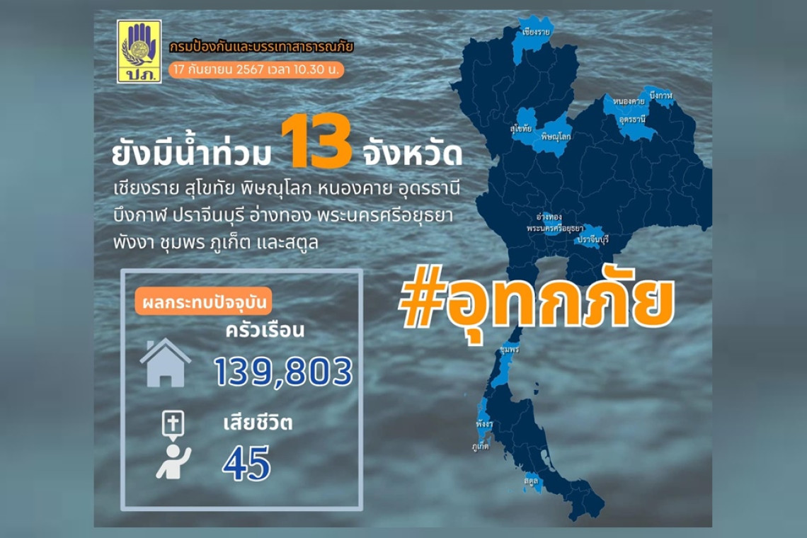 วันที่ 17 ก.ย. 67 กรมป้องกันและบรรเทาสาธารณภัย (ปภ.) รายงานว่าในระหว่างวันที่ 16 ส.ค. – 17 ก.ย. 67 เกิดสถานการณ์น้ำท่วมในพื้นที่ 30 จังหวัด ได้แก่ เชียงราย เชียงใหม่ แม่ฮ่องสอน ตาก พะเยา น่าน ลำพูน ลำปาง แพร่ อุตรดิตถ์ สุโขทัย พิษณุโลก นครสวรรค์ เพชรบูรณ์ เลย อุดรธานี หนองคาย บึงกาฬ หนองบัวลำภู ปราจีนบุรี อ่างทอง พระนครศรีอยุธยา ระยอง ชุมพร ภูเก็ต ยะลา นครศรีธรรมราช พังงา ตรัง สตูล รวม 150 อำเภอ 672 ตำบล 3,525 หมู่บ้าน ประชาชนได้รับผลกระทบ 139,803 ครัวเรือน มีผู้เสียชีวิตรวม 45 ราย และได้รับบาดเจ็บรวม 24 คน ซึ่งปัจจุบัน ยังคงมีสถานการณ์อุทกภัยในพื้นที่ 13 จังหวัด รวมพื้นที่ได้รับผลกระทบ 45 อำเภอ 192 ตำบล 934 หมู่บ้าน ประชาชนได้รับผลกระทบ 27,831 ครัวเรือน รายละเอียด ดังนี้