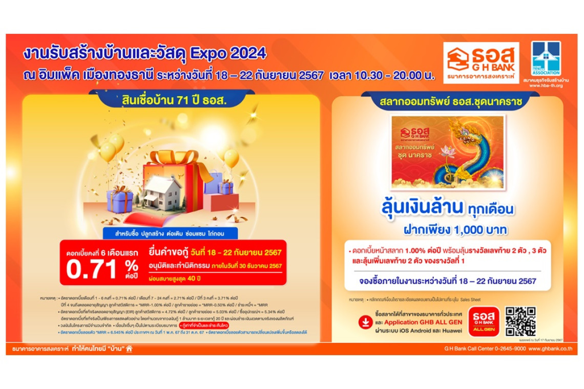 ธนาคารอาคารสงเคราะห์ (ธอส.) ในฐานะสถาบันการเงินของรัฐ ที่มีพันธกิจ “ทำให้คนไทยมีบ้าน” พร้อมสนับสนุนให้คนไทยได้มีที่อยู่อาศัยเป็นของตนเอง ด้วยการจัดโปรโมชันทางการเงินร่วมงาน “รับสร้างบ้านและวัสดุ Expo 2024” นำโดย 1) สินเชื่อบ้าน 71 ปี ธอส. อัตราดอกเบี้ยต่ำ 6 เดือนแรก เพียง 0.71% ต่อปี, เดือนที่ 7 - 24 เท่ากับ 2.71% ต่อปี, ปีที่ 3 เท่ากับ 3.71% ต่อปี (อัตราดอกเบี้ยเฉลี่ย 3 ปีแรก เท่ากับ 2.71%) ปีที่ 4 จนถึงตลอดอายุสัญญา กรณีลูกค้าสวัสดิการ เท่ากับ MRR-1.00% ต่อปี และกรณีลูกค้ารายย่อย เท่ากับ MRR-0.50% ต่อปี กรณีชำระหนี้ เท่ากับ MRR (อัตราดอกเบี้ย MRR ของ ธอส. ในปัจจุบันเท่ากับ 6.545% ต่อปี) ให้กู้สำหรับลูกค้าที่ต้องการซื้อ ปลูกสร้าง ต่อเติม ซ่อมแซม และไถ่ถอนจำนองจากสถาบันการเงินอื่น (รีไฟแนนซ์) ผ่อนชำระนานสูงสุด 40 ปี กรณีกู้ 1 ล้านบาท ผ่อนชำระเริ่มต้นเพียง 2,400 บาท/เดือน เท่านั้น! ยื่นคำขอกู้ได้ตั้งแต่บัดนี้ และทำนิติกรรมภายในวันที่ 30 ธันวาคม 2567