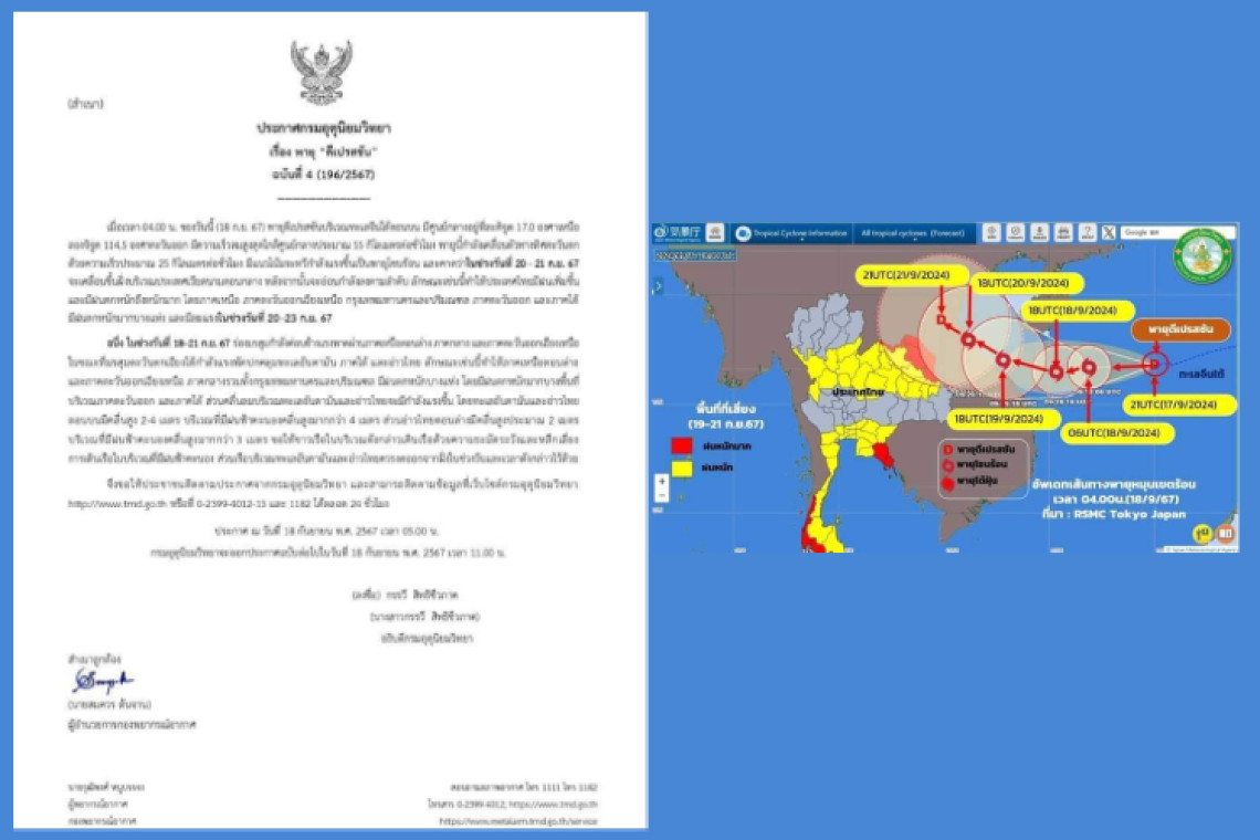 คาดว่าในช่วงวันที่ 20 – 21 ก.ย. 67 จะเคลื่อนขึ้นฝั่งบริเวณประเทศเวียดนามตอนกลาง หลังจากนั้นจะอ่อนกำลังลงตามลำดับ ลักษณะเช่นนี้ทำให้ประเทศไทยมีฝนเพิ่มขึ้นและมีฝนตกหนักถึงหนักมากและมีลมแรงในช่วงวันที่ 20–23 ก.ย. 67 ยังต้องติดตามมาพร้อมกัน คือ มรสุมตะวันตกเฉียงใต้ จะยังมีกำลังแรง
