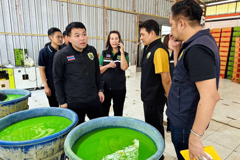 ซึ่ง จนท. ได้เก็บตัวอย่างสี และสาร ที่พบใน 2 โรงคัดบรรจุแรก ไปตรวจสอบทางห้องปฏิบัติการเนื่องจากไม่ปรากฏเอกสารผ่านการอนุญาตตามมาตรฐาน อย. และไม่ได้รับอนุญาตจากกรมวิชาการเกษตร โดยคาดว่าภายในวันพรุ่งนี้ (19 ก.ย.67) จะทราบผลการส่งตรวจหาสารประกอบภายในว่ามีอะไรบ้าง