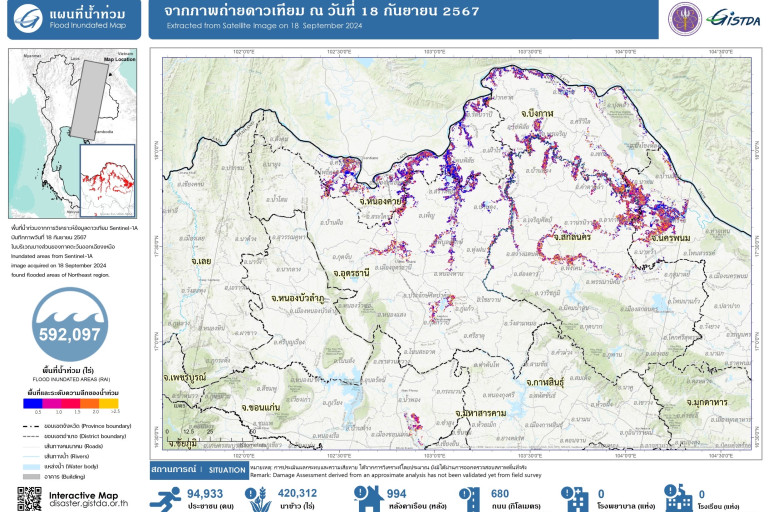 GISTDA ติดตามสถานการณ์น้ำท่วมด้วยข้อมูลภาพจากดาวเทียม Sentinel-1A ของวันที่ 18 กันยายน 2567 พบน้ำท่วมขังบริเวณ #หนองคาย 169,520ไร่, #นครพนม 116,602 ไร่, #สกลนคร 112,207 ไร่, #อุดรธานี 101,429 ไร่, #บึงกาฬ 83,574 ไร่ และ #ขอนแก่น 8,764 ไร่ รวมพื้นที่ประมาณ 592,096 ไร่ ส่วนใหญ่เป็นพื้นที่ปลูกข้าว 420,312 ไร่ (ข้อมูลพื้นที่ปลูกข้าวจากดาวเทียม ณ วันที่ 13 กันยายน 2567) รวมถึงชุมชนที่อยู่อาศัย และเส้นทางคมนาคม
