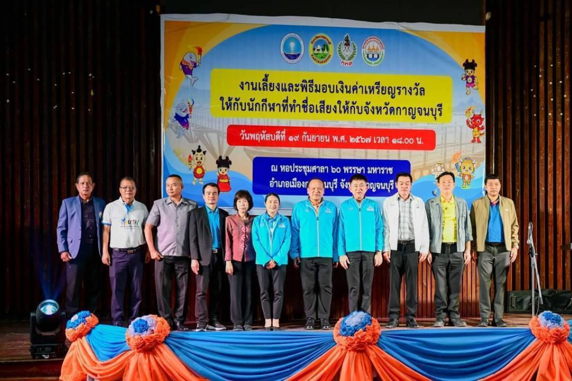 ผู้สื่อข่าวรายงานว่า เมื่อเวลา 18.30 น.ของวันที่ 19 กันยายน 2567 ที่ ศาลา 60 พรรษามหาราช เทศบาลเมืองกาญจนบุรี จังหวัดกาญจนบุรี น.พ.ปริพนท์ จุลเจิม นายแพทย์สาธารณสุขจังหวัดกาญจนบุรี มอบหมายให้ ทพญ.ลักขณา กิตติวโรดม รองนายแพทย์สาธารณสุขจังหวัดกาญจนบุรี เข้าร่วมงานเลี้ยงและพิธีมอบเงินรางวัล ให้กับนักกีฬาที่ทำชื่อเสียงให้กับจังหวัดกาญจนบุรี โดยมีนายรณภพ เวียงสิมมา รองผู้ว่าราชการจังหวัดกาญจนบุรี เป็นประธาน