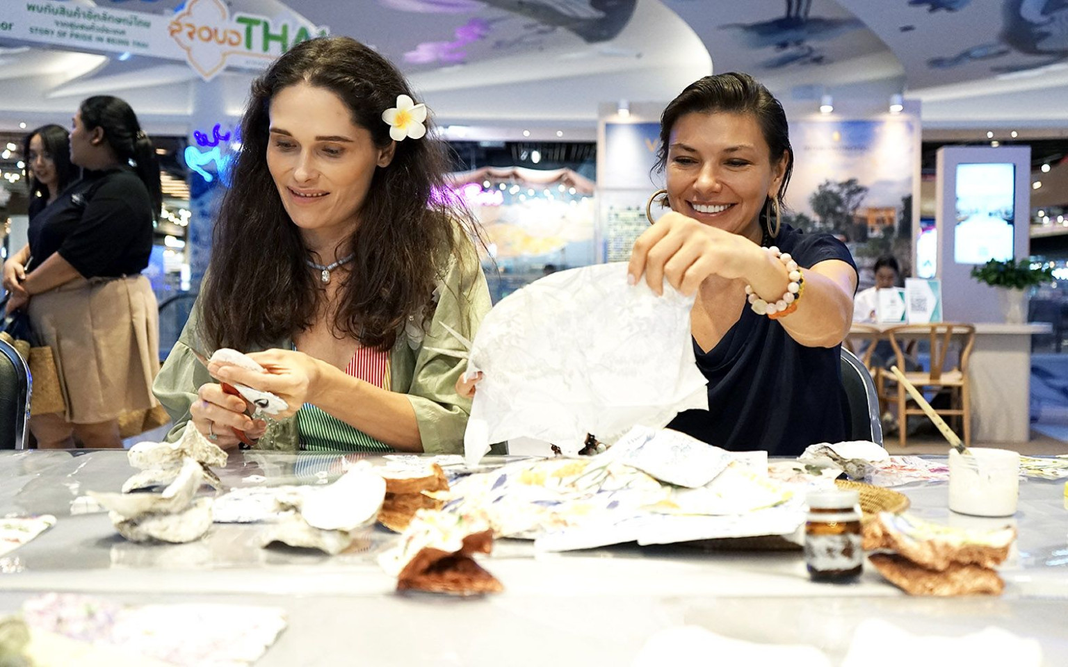 จากนั้นทางคณะได้เข้าร่วมกิจกรรมเวิร์คช้อปที่ทางบลูพอร์ต หัวหิน จัดไว้ต้อนรับ ที่ ลาน เอเทรี่ยม ชั้น G โดยเป็นกิจกรรมการเรียนรู้วิธีการเพ้นท์หอยนางรม จากหมู่บ้านศิลปิน โดยมีวิทยากรจากหมู่บ้านศิลปินมาร่วมให้ความรู้พร้อมแนะนำวิธีการทำ ที่ได้แรงบันดาลใจมาจากการเก็บเปลือกหอยเหลือใช้มาสร้างสรรค์ ผ่านการทดลอง เพื่อนำกลับมาใช้ใหม่ ด้วยความตั้งใจที่จะลดขยะหมุนเวียน สร้างประโยชน์ให้วัสดุที่เหลือใช้เพื่อนำกลับมาใช้ได้อีกครั้งและเป็นของประดับที่สวยงามได้อีกด้วย ซึ่งกิจกรรมเวิร์คช้อป นอกจากจะได้ร่วมสนุกแล้ว ยังได้เรียนรู้ขั้นตอนต่างๆของชิ้นงาน ตั้งแต่วิธีการเตรียมอุปกรณ์เพ้นท์ลาย ลงสี จนสำเร็จเป็นลวดลายสีสันสวยงาม หลังจากเสร็จกิจกรรม ปิดท้ายด้วยการมอบของที่ระลึกเป็นผลิตภัณฑ์กระเป๋าสานกระจูด ภูมิปัญญาไทย จากพราวไทย โดยกิจกรรมดำเนินไปด้วยความสนุกสนานและรอยยิ้มแห่งความประทับใจของคณะผู้ร่วมกิจกรรมในครั้งนี้