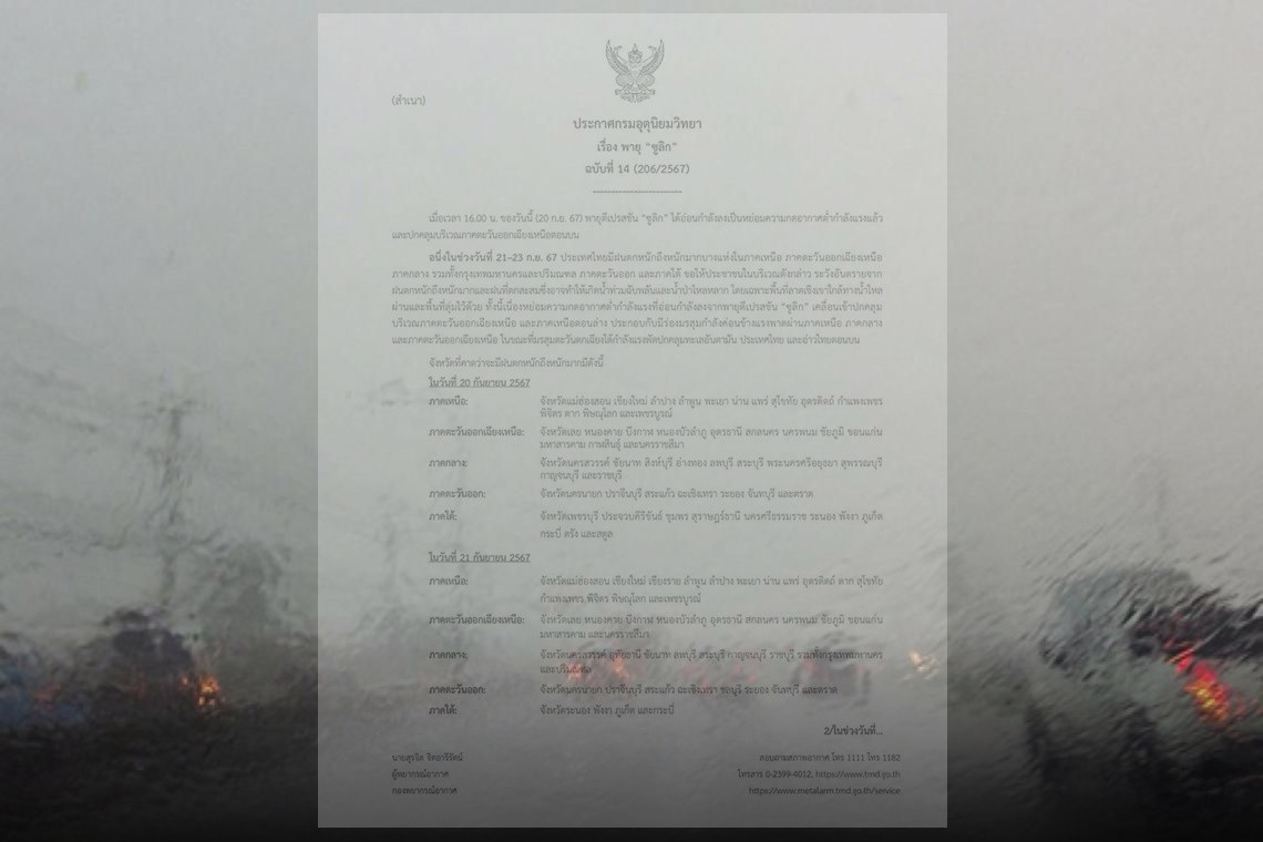 “กรมอุตุฯ” ออกประกาศเตือนฉบับที่ 14 พายุดีเปรสชัน "ซูลิก" อ่อนกำลังลงเป็นหย่อมความกดอากาศต่ำกำลังแรง-ปกคลุมบริเวณภาคอีสานตอนบน เตือน 51 จังหวัดรับมือช่วง 21-23 ก.ย.นี้
