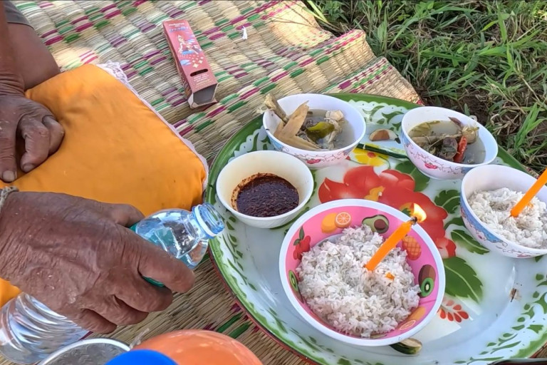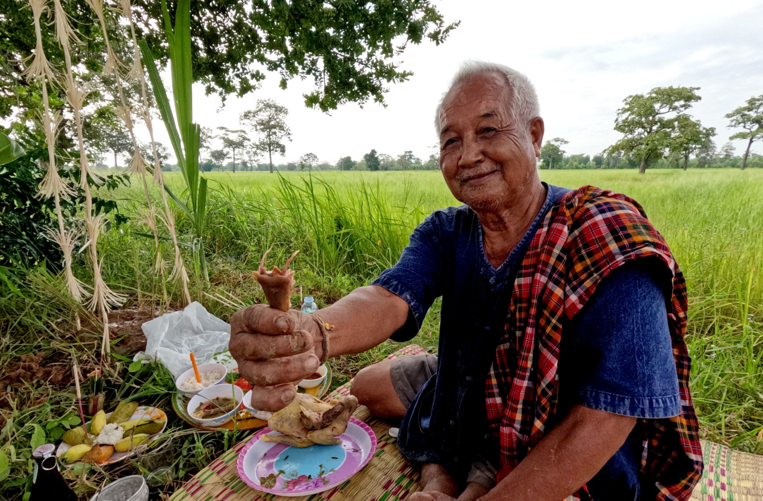 เมื่อวันที่ 21 ก.ย.67 ผู้สื่อข่าวรายงานว่านายเวียน ราชประโคน อายุ 83 ปี ชาวนาบ้านสะเดา ต.สะเดา อ.พลับพลาชัย จ.บุรีรัมย์ พร้อมบุตรหลานและญาติพี่น้อง นำเครื่องเซ่นไหว้บูชา เพื่อนำไปประกอบพิธีกรรม ‘จับเดิมปู๊จ’ ซึ่งเป็นภาษาเขมร หรือแปลเป็นภาษาไทยเรียกว่า พิธีรับขวัญปักข้าวพันธุ์ ซึ่งเป็นพิธีกรรมความเชื่อโบราณของชาวนาที่มีเชื้อสายเขมรถิ่นไทย
