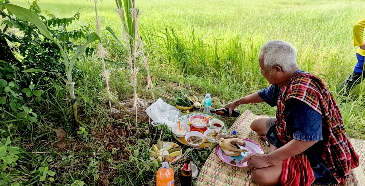 จากนั้นผู้ประกอบพิธี ที่เรียกว่า ‘เจ้าจ้า’ ก็จะทำการบอกกล่าวแก่บรรพบุรุษปู่ย่า ตายาย เจ้าป่า เจ้าเขา ผีบ้านผีเรือน และเจ้าที่เจ้าทางทั้งหลาย ว่าถึงฤดูกาลทำนา ลูกหลานกำลังจะลงปักดำแล้ว พร้อมกับบน บาน สาร กล่าว ให้ข้าวที่ทำการปักดำ มีความอุดมมบูรณ์ เจริญงอกงาม และได้ผลผลิตดี สวยสมบูรณ์ หลังจากนั้นนำกล้าพันธุ์ต้นข้าวลงปักดำลงบริเวณที่ทำพิธีครบตามจำนวน 7 วันตามสัปดาห์ แล้วเอาไม้ไผ่ทั้ง 4 ด้ามมาปักล้อมกล้าต้นข้าว และนำต้นกล้วยกับต้นอ้อยลงปลูกกับดินข้างๆกล้าต้นข้าวที่ปักดำ ก่อนจะนำเหล้า เบียร์ น้ำหวาน และน้ำเปล่า มารินเทใส่กับสำรับอาหาร จำนวน 3 ครั้ง เพื่อเรียกให้ดวงวิญญาณ บรรพบุรุษปู่ย่า ตายาย เจ้าป่า เจ้าเขา ผีบ้านผีเรือน และเจ้าที่เจ้าทางทั้งหลาย มาดื่มกินเครื่องเซ่นไหว้