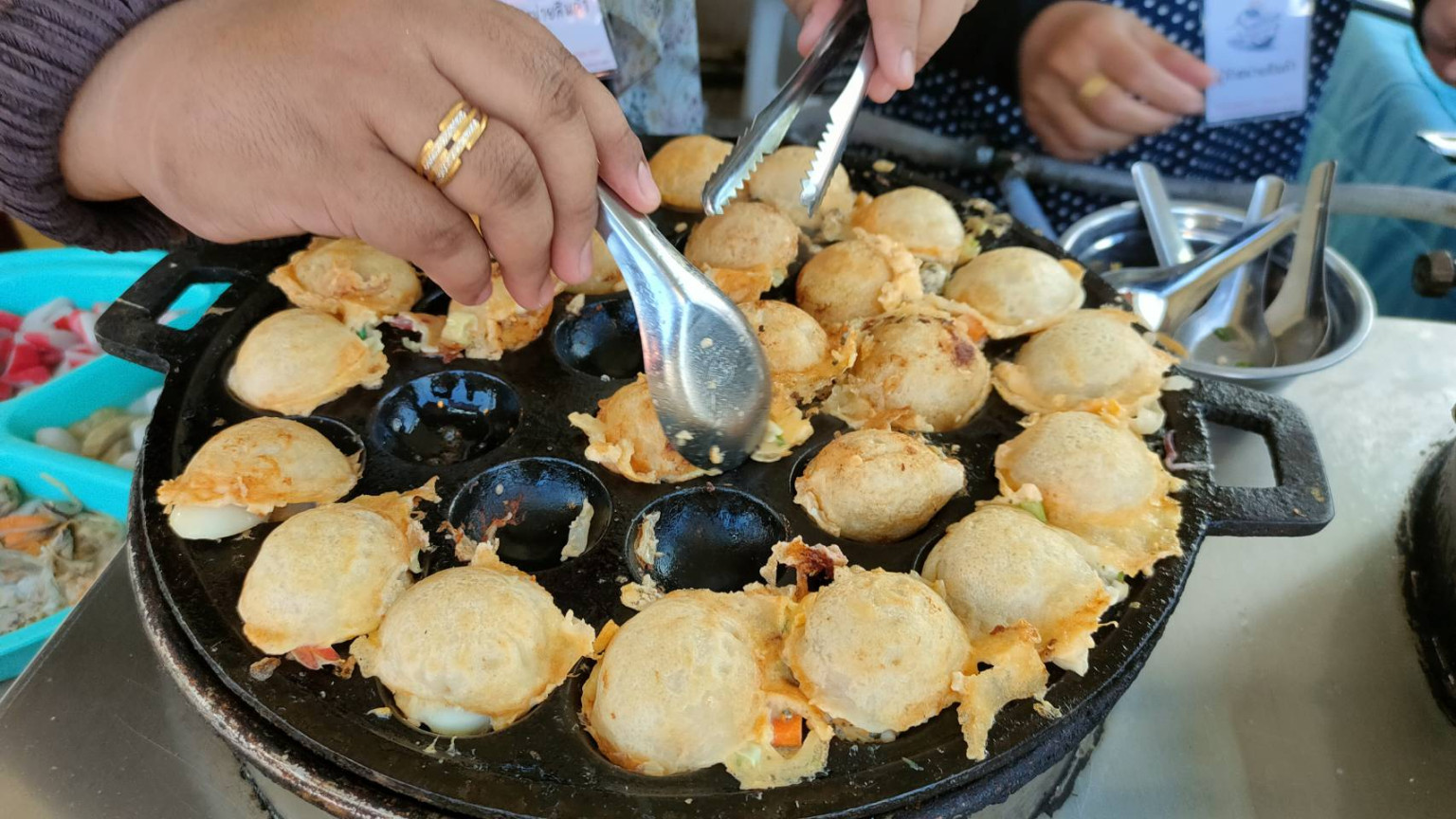 ขนมครกซีฟู้ดของที่นี่มีให้เลือกหลากหลายไส้ ทั้งกุ้ง ปลาหมึก หอย ปูอัด ไข่นกกระทา ไข่ไก่ และลูกชิ้นปลา นอกจากนี้ยังมีผักเพิ่มความสดชื่น เช่น กะหล่ำ แครอท และต้นหอม จุดเด่นของร้านนี้คือการใส่วัตถุดิบแบบไม่อั้น ชิ้นใหญ่ๆ ทำให้หน้าตาน่ารับประทาน และรสชาติอร่อยถูกปาก โดยเฉพาะน้ำจิ้มสูตรพิเศษที่เป็นเอกลักษณ์ไม่เหมือนใคร